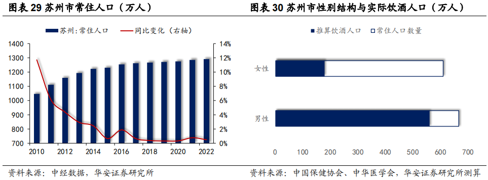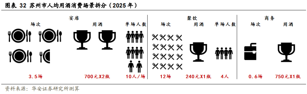 人口基数大增长慢,外来人口占比大。苏州市为江苏省人口第一大市,常住人口连续多年在1200万人以上,但增速上略弱于南京市,数量增长长期低于1%。结构方面,发达的二产基础与地理优势吸引了大量的外来务工人口,同时也造就了海纳百川的独特白酒市场。截至2022年末,苏州市常住人口1291.10万人,其中男性占比52.22%,女性占比47.78%(七普数据),按照比例推算,苏州市实际饮酒人口约为738万人,对应人均年饮白酒量约为1490元。与南京相比,苏州市白酒规模更大,但人均饮白酒量低于南京。主要系常住人口中外来务工人员占比较大,与本地户籍人口相比,其消费力更低,同时,人际关系相对更为简单——前者导致自饮、商务等场景人均用酒等级偏低,后者导致宴席等消费场景参与次数下降。此外,苏州第二产业更为发达,商务活动相比南京频次更多,但高端商务引领性不如南京。因此,同样考虑白酒三大消费场景宴席、聚饮、商务,我们对2022年苏州市人均年饮白酒量做以下假设拆分:1)宴席:假设每人年参与宴席场次3.5场(婚宴、寿宴、升学宴各一场,其他宴席0.5场),单场用酒2瓶,单瓶价格在600元,单场人数10人;2)聚饮:假设每人年参与聚饮场次12场(平均每月一场),单场用酒1瓶,单瓶价格在225元(200-250元价格带),单场人数4人;3)商务:假设每人年参与商务活动场次0.6次,单次用酒1瓶,单瓶价格在650元。计算可得每人年饮酒量在1485元,基本符合前述人均1490元的计算情况,假设条件合理。根据前文推算,截至2025年,苏州市白酒市场规模将达到124亿左右,假设苏州市常住人口2022-2025年复合增长率为0.4%(过去5年常住人口CAGR为0.5%),对应人均饮酒量为1659元。考虑宴席、聚饮、商务三个消费场景的变化情况,做如下分析:①宴席场次和人数无明显变化,但宴席用酒价格伴随消费升级有所提升,幅度和收入增速基本一致,高于CPI增速;②聚饮场次和人数无明显变化,但聚饮用酒价格伴随消费升级有所提升,由于“面子”属性较弱且自饮等场景更加追求性价比,增速应小于宴席用酒价格增幅;③商务用酒方面,考虑到苏州商业活动已经较为发达,频次预计变化不大,未来提升主要体现在用酒档次及价格上。相对应对2025年苏州市人均年饮白酒量做以下假设拆分:1)宴席:假设每人年参与宴席场次3.5场(婚宴、寿宴、升学宴各一场,其他宴席0.5场),单场用酒2瓶,单瓶价格在700元(对应复合增速5.3%),单场人数10人;2)聚饮:假设每人年参与聚饮场次12场(平均每月一场),单场用酒1瓶,单瓶价格在240元(对应复合增速 2.9%),单场人数4人;3)商务:假设每人年参与商务活动场次0.6次,单次用酒1瓶,单瓶价格在750元(对应复合增速4.9%)。计算可得每人年饮酒量在1660元,基本符合前述人均1659元的计算情况,假设条件合理。综合来看,至“十四五”末,苏州白酒市场主要在价格方面有一定增长空间,频次变化不大。宴席活动用酒主流价格带由600元逐步提升至600-800元左右,聚饮/自饮用酒主流价格带由200-250元逐步升级至接近250元,商务礼赠用酒主流价格带由600元+逐步提升至接近800元。(刘略天系华安证券食品饮料首席分析师,万鹏程系华安证券食品饮料分析师)(信息来源:华夏酒报)