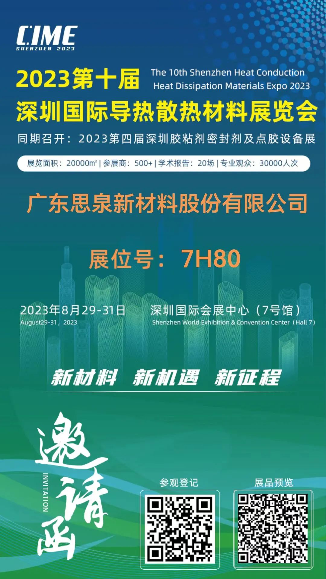 目前国内导热散热材料行业发展迅速,但由于行业发展起步相对较晚,行业集中度仍然不高,相较于国际水平仍有一定差距,导热散热材料和技术的自主化、国产化迫在眉睫。为了促进导热散热材料领域的相互合作与交流,思泉新材将于2023年8月29-31日参加CIME2023第十届深圳国际导热散热材料及设备展览会,届时欢迎各界朋友莅临思泉展厅咨询业务合作。具体信息如下: