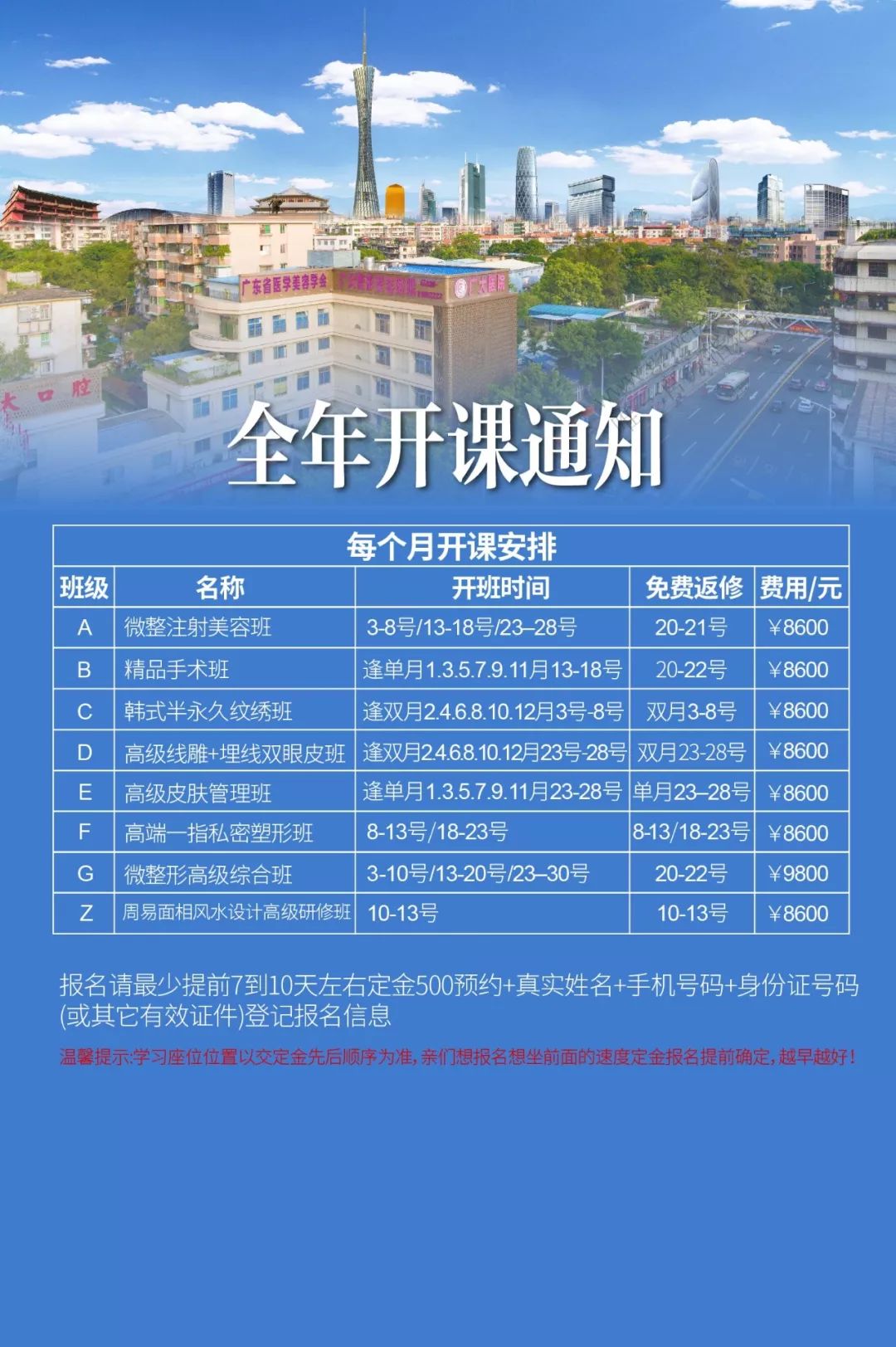 温馨提醒:预约上课必须于开课时间前10天预交定金500-1500。