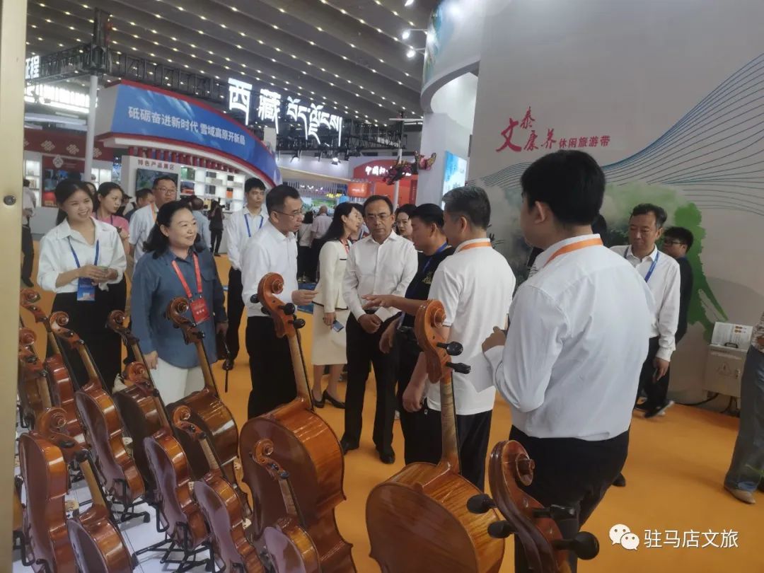 文化和旅游部产业发展司司长缪沐阳,在河南省文化和旅游厅二级巡视员刘春晓等领导的陪同下来到2号交流合作馆河南展厅巡展。在确山小提琴展台前,驻马店市文广旅局局长赖小青向部省有关领导详细介绍了确山小提琴产业发展情况,河南省金鸣乐器股份有限公司董事长王金堂介绍了确山小提琴制作工艺。17日下午,河南省金鸣乐器股份有限公司董事长王金堂进行了现场宣传推介。截止8月19日,我市确山小提琴此次展会上的销售额已突破50万元。与西安两所培训学校建立了合作关系,签订了价值200多万元的订单,其中一所培训学校预订了20多把大提琴。