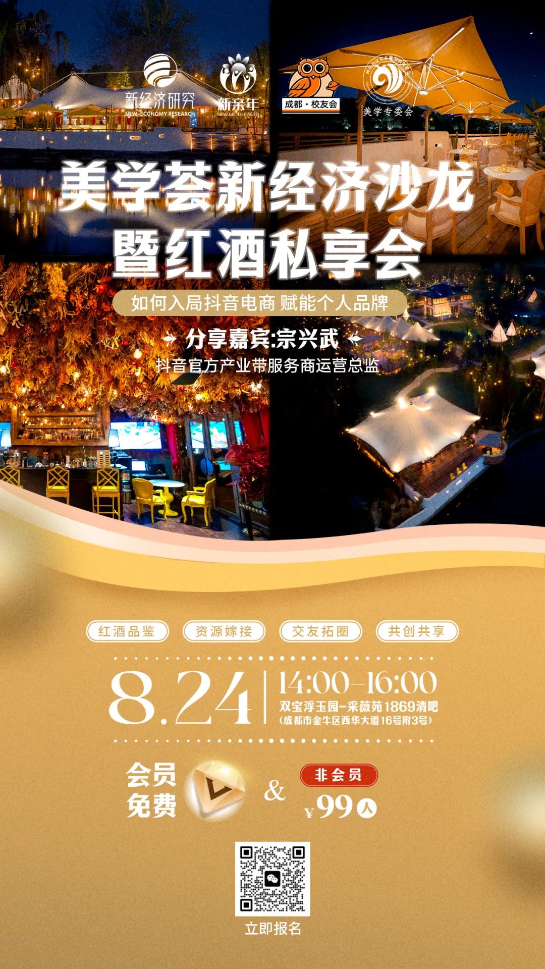 由新经济研究、新亲年俱乐部、得到高研院成都校区校友会及美学专委会联合举办的美学荟新经济沙龙暨红酒私享会将于2023年8月24日14:00-16:00在双宝浮玉园-采薇苑1869清吧举行。