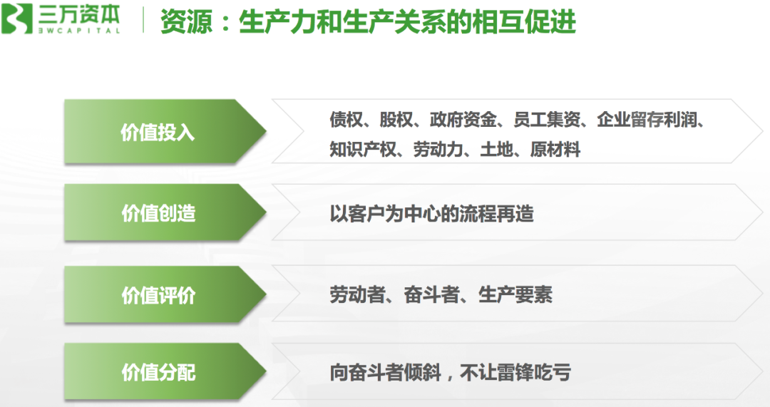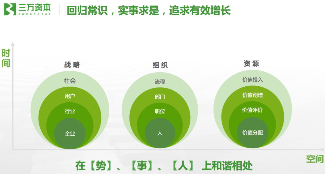 战略分为社会、用户、行业和企业;组织分为流程、部门、岗位、人;然后是资源,分为价值投入、价值创造、价值评价和价值分配。最后,要加一个时间轴和空间轴。