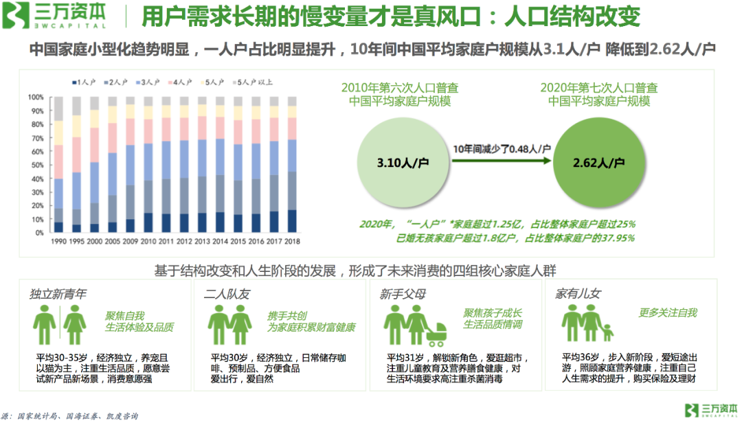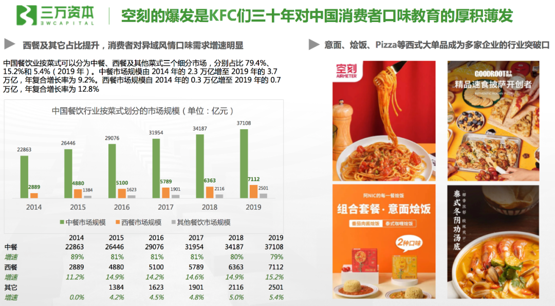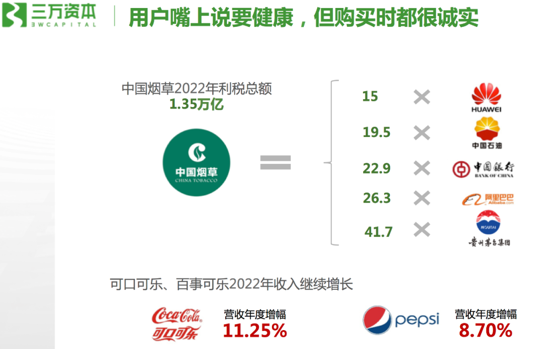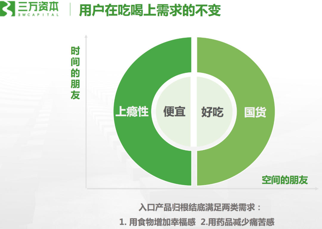 这是我们带过来的项目,在外面有一个展台叫三都港,三都港的尤总在这次的大会上也讲了他的“大黄鱼理想”,这也是带动一产到三产。从用户角度看,你要做一个入口的东西,不管你是饮料、零食还是保健品、滋补品,最终大多数需求都是不变的需求,比如内核还是要好吃、便利,降低用户的决策成本和购买成本;外核叫上瘾性和新国货,这是我们比较喜欢的四个要素。最伟大的食品饮料公司都是有上瘾性的,最后就解决两类需求:一是,用食物增加用户的幸福感;二是,用药品降低用户的痛苦感。“吃”大概13万亿左右,在社会零售里面,餐饮4800多亿,其他的米面粮油酱醋茶,酒水饮料和零食这些加起来8万亿多一点。 我们内部把上瘾性分为七个层次,第一,是毒品;第二,是烟草;第三,是白酒;第四,二氧化碳,咖啡和茶;第五,刺激性食物,榴莲、螺蛳粉等;第六,辣味食品;第七,甜味食品。这些最伟大的食品饮料企业都是利用了人性的七宗恶,贪婪、上瘾等。但什么是食品最大的善?就是“用吃增加用户的幸福感”,所以可口可乐、雀巢、百威这些最伟大的公司,能穿越一个又一个的周期,能一直活得不错。其实,用户都在讲健康,但在购买的时候特别诚实,所以你看可口可乐、百事,去年都增长了不少。我们内部也这么讲,去寻找“类毒品生意”,去满足用户的第一性。第二,我们也比较喜欢“中国品类”,也发掘了不少中国品类,比如说云耕物作的红糖,比如说花胶,在2018年和2019年发掘这些品类的时候,确实是小品类,可能很多人都没听过什么叫花胶,海里面有鱼翅鲍肚参,山禽、燕窝、人参、枸杞、虫草,滋补的12个品类,我们去发掘这些“中国品类”,因为大国崛起一定会有“大国品类”。一战之后的英国,二战之后的美国,先是输出科技和金融,然后是文化体系,好莱坞,格莱美,你的快消品一定会被带出去的,不管它叫可口可乐、星巴克,还是KFC,我们现在也是一样,00后会吃中国零食。我们不怎么看短期风口,客观讲,在这一波新消费里面赚到钱的机构,不超过五家,我觉得我们还是赚到钱的。因为我们入场早,2017年和2018年时,很多人都赚到了很多估值,我们很多项目实现了成功退出。因为我们比较关注特别长期的东西,核心是要找到“电梯品类”,什么叫“电梯品类”?用户长期向上的需求,我们内部不太喜欢涨2的3次方的需求,我们比较喜欢1.2的30次方的需求,就是每年增长20%,增长30年,什么样的需求是这样的需求?餐桌的五个东西,主食、食材、调味、酒水饮料和甜点,主食一直在往下走,食材里面的猪肉也在往下走,蛋白类在往上走,维生素也在往上走,这些是确定不变的,而且是几十年确定不变的,你在电梯里面即使什么都不变,这个电梯每天每年往上开20%,你投资的项目也就往上开20%。所以我们天天去探索怎么样用吃增加用户的幸福感,或者降低用户的痛苦感。我们是这么来看品类的,这也是我一个好朋友的公司叫空刻,也是这几年崛起的一个新品牌。大家本来就吃意面的红利,线下有这么多必胜客已经把用户需求教育完了,他无非用一个零售化的产品在抖音,叫做用算法心智收割的人心心智。那些新的独角兽到底怎么诞生的?左边就是用户稳定向上的慢变量的需求,这是需求侧。供给侧就是这些快变量,它可能是流量,可能是渠道,可能是数字化,可能是新型的组织,这是我们比较关注的八大品类,核心就两个,其实你看吃的只有两条线:一条,是低毛利的线,像圣农做的事情,你就必须全产业链,你只做品牌,利润是不够养活公司的;另一条线,是高毛利的品类,像可口可乐这种,你就需要跟渠道合作,我觉得渠道再强,也不可能做出一个沃尔玛的可乐,因为它是绝对的快消品。站在产业的角度,一个企业要判断自己在产业链的哪个位置。比如说预制菜,我们比较喜欢微笑曲线两头的企业,预制菜我个人觉得最终是一个渠道驱动的生意,不是品牌驱动的生意,所以我们不怎么参与预制菜品牌。酸菜鱼的最优解决方案是什么?肯定是盒马把鱼切成鱼片,再配一个酸菜鱼的调味包,30分钟送到你家里,而不是在冰箱冻一个365天的鱼片。其实,新消费品牌能起来,本质就是它在产品上做的一些微创新,刚好碰到了渠道的变迁,才能脱颖而出,做到10个亿左右,但往往你做到10个亿的时候,你的产品不再新,渠道红利消失,这是大家应该去探索的问题。怎么样实现二次增长?这是个比较网红的项目,创始人2019年底2020年年初来找到我们,拿的就是左边这个产品,就长的特别像药,跟我讲这个饮料有多好,里面有胶原蛋白,能助眠。我说,我都喝饮料了,饮料的第一性到底是什么?饮料的第一性是让用户爽。如果要补充这些,我会去吃维C等。吃这些东西,你没法讨好所有的用户。所以,我说能不能把这些东西都不要,价格从16.8元一瓶降到10块钱以下,9.9是CBS动销的生死线,做饮料,我们加更多的柠檬酸,让这个东西变得更酸,喜欢酸的用户就爱你爱的要死,不喜欢酸的用户会离开你。这个时候,你在喜欢酸的用户面前就有定价权了。被你的用户追,你就拥有定价权了,这个时候你在渠道上做投放就有穿透力了。这是我们另外一个项目,叫官栈。当你定了战略之后,怎么实现?我觉得它是一套系统的动作,你看我们当初给官栈出了一篇叫海洋滋补的报告,你怎么实现它?下面中间那张图叫做滋补的12个流程,前台、中台、后台,到部门到岗位到人,最后来制定行业标准