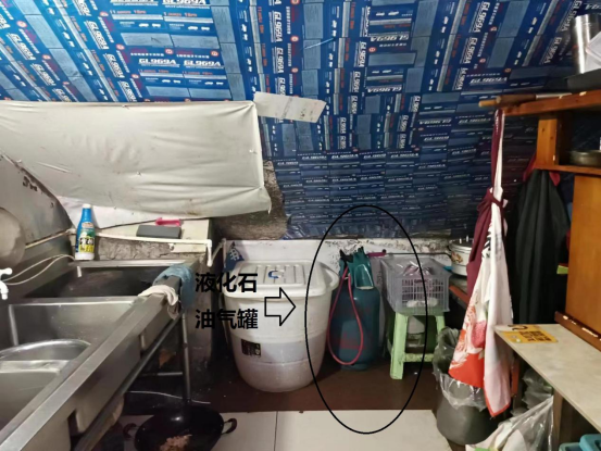 安全隐患:液化石油气和醇基液体燃料在同一房间内存储、使用,且燃气泄漏报警装置不能正常使用。