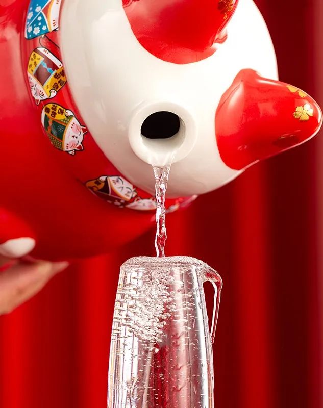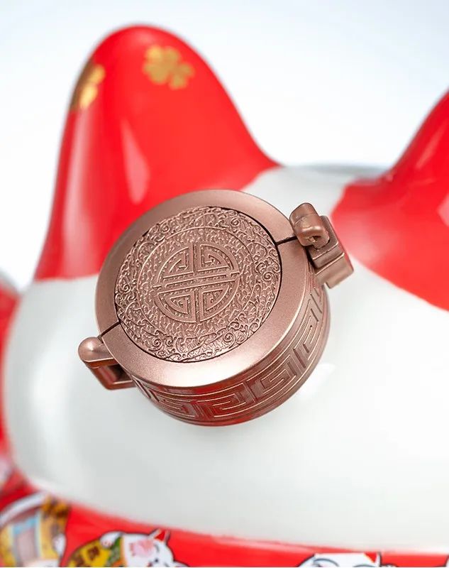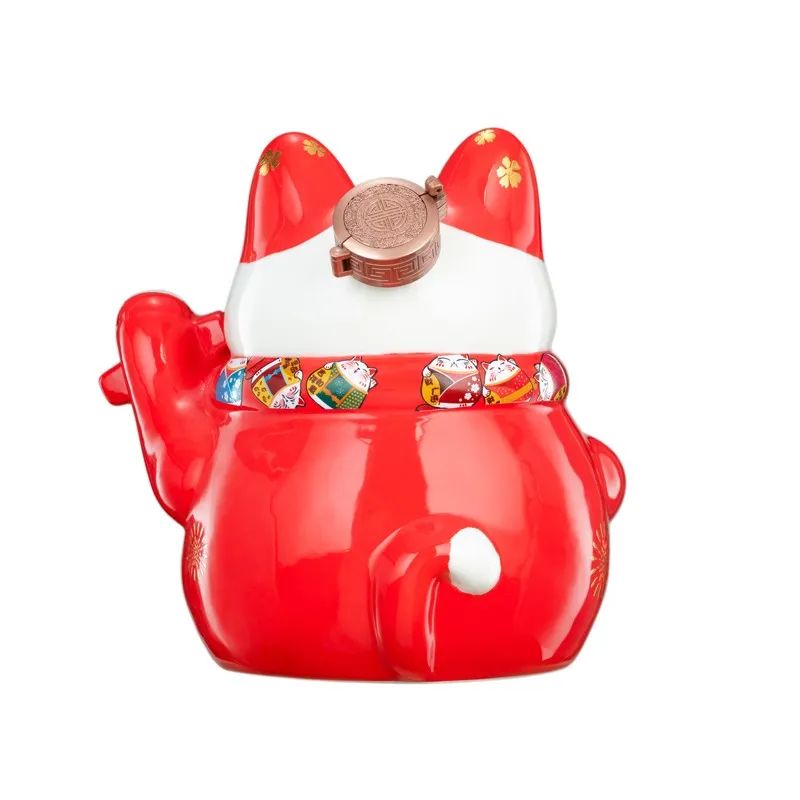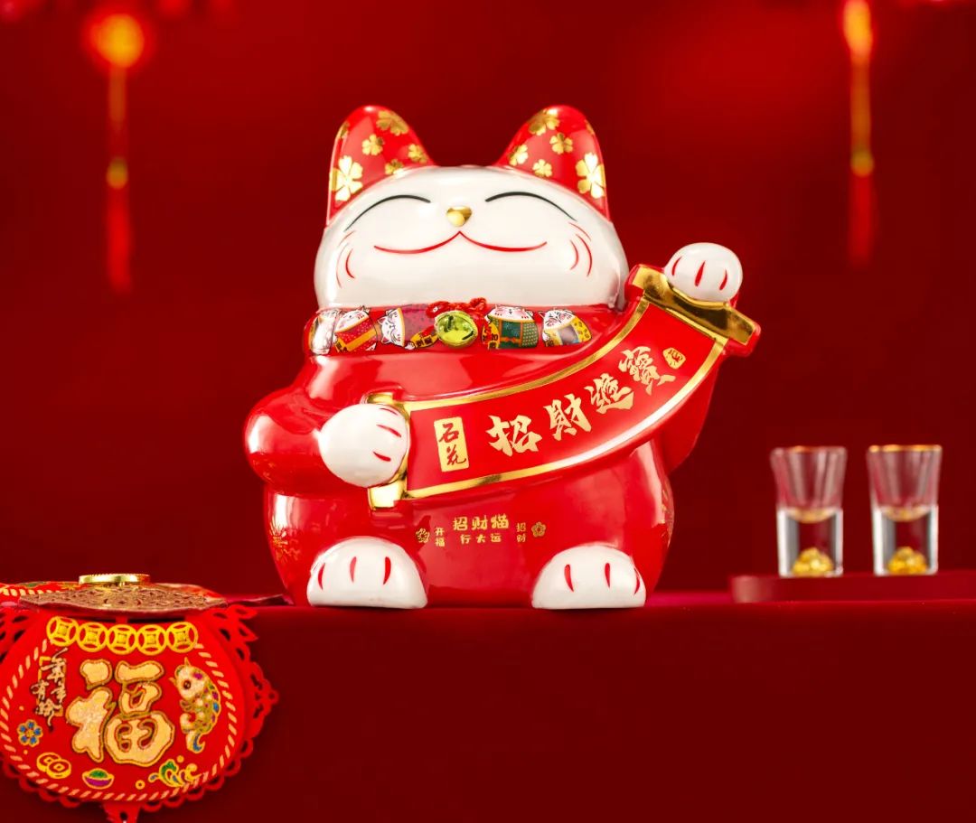 招财猫的表情和动作栩栩如生,酒瓶上的细节满满还印有圆滚滚可爱的小猫。