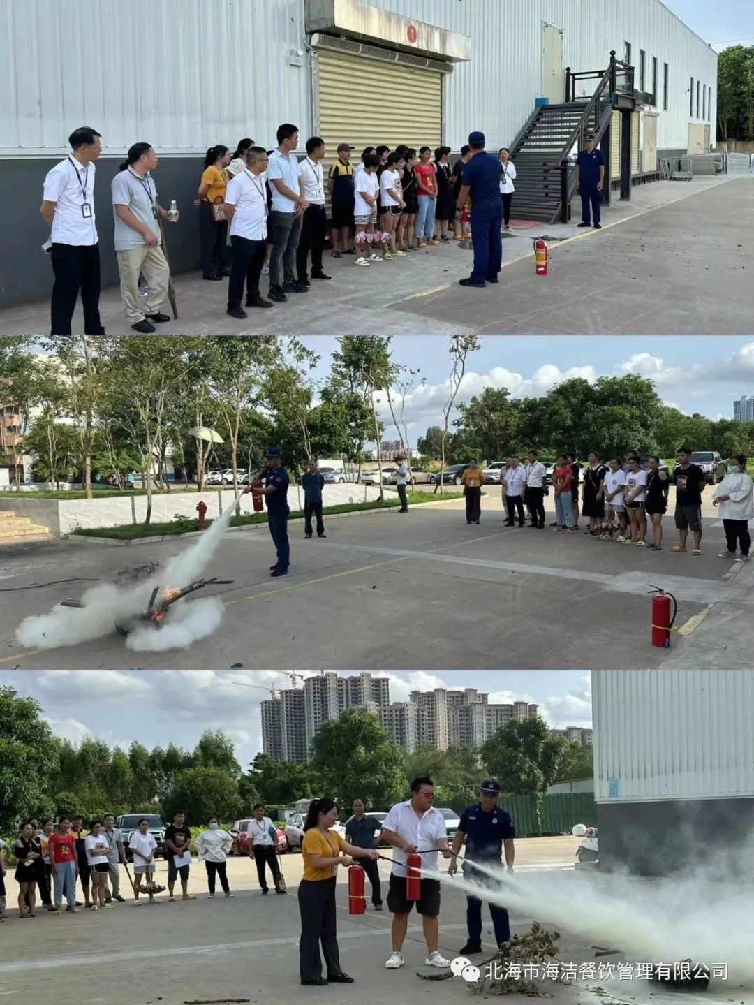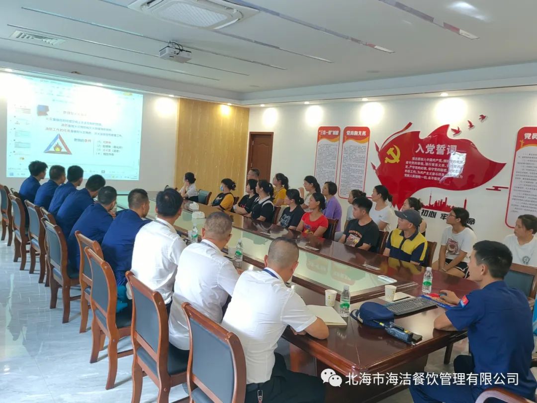 为了提高北海市海洁餐饮管理有限公司(以下简称“海洁公司”)职工消防应急能力,保障人员生命和财产的安全,加强消防安全意识、掌握消防安全技能,最大限度的减少火灾事故损失和事故造成的负面影响。8月18日下午,海洁公司举行2023年消防安全培训及灭火应急疏散演练。北海市海城区香港路特勤站黄喜站长带队对演练进行现场消防安全培训指导,广西光远投资发展集团有限公司及子分公司40余人参与此次活动。