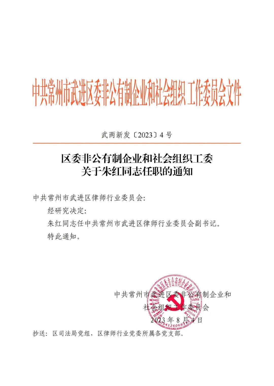 近日,经中共常州市武进区委非公有制企业和社会组织工作委员会研究决定,朱红同志任中共常州市武进区律师行业委员会副书记。此次任命,是对朱红同志多年来在武进区律师行业中的突出贡献的认可与肯定。