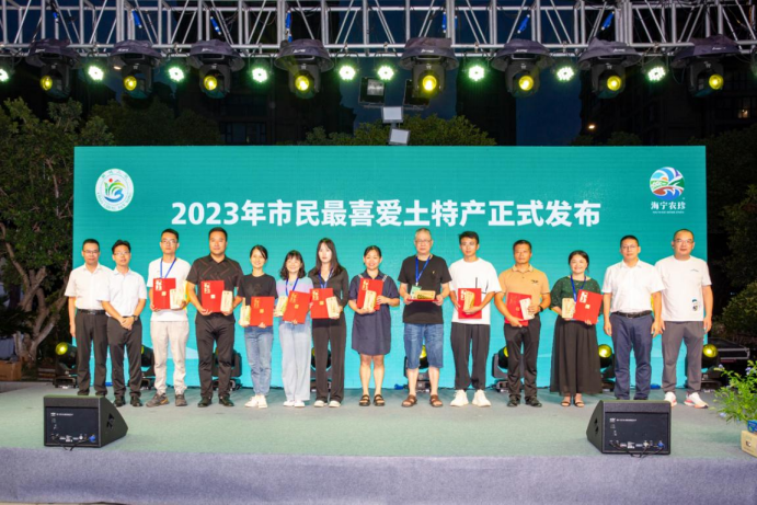 本次展销活动前,我市还开展了2023年“农商行杯”市民最喜爱土特产评选活动,面向全市各镇街招募优质特色农产品29个,最终有十个产品获得本届“市民最喜爱土特产”称号,并举办发布会,为十佳土特产进行表彰。现场海宁市副市长任博为本次活动致辞,肯定了我市农业品牌建设工作成效。