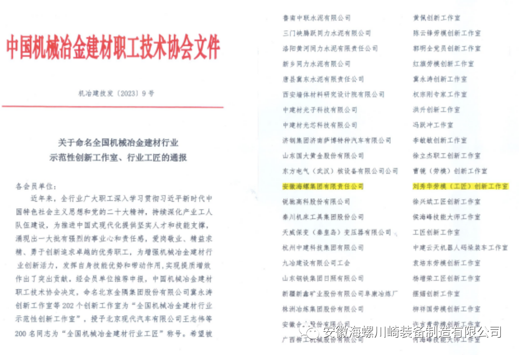 为充分发挥劳模、工匠先进典型的辐射引领作用,广泛组织动员广大产业工人创新创造,推动公司高质量发展,2012年,由“全国五一劳动奖章获得者”刘秀华同志牵头成立了“刘秀华职工(劳模)创新工作室”。2018年4月,刘秀华创新工作室正式获芜湖市总工会授牌。2021年11月24日,创新工作室获安徽省总工会授牌。2021年12月8日,刘秀华劳模创新工作室获海螺水泥股份党委命名首批海螺水泥职工(劳模)创新工作室。2023年4月,刘秀华职工(劳模)创新工作室又获评海螺集团首批示范性职工创新工作室和全国机械冶金建材行业示范性创新工作室。
