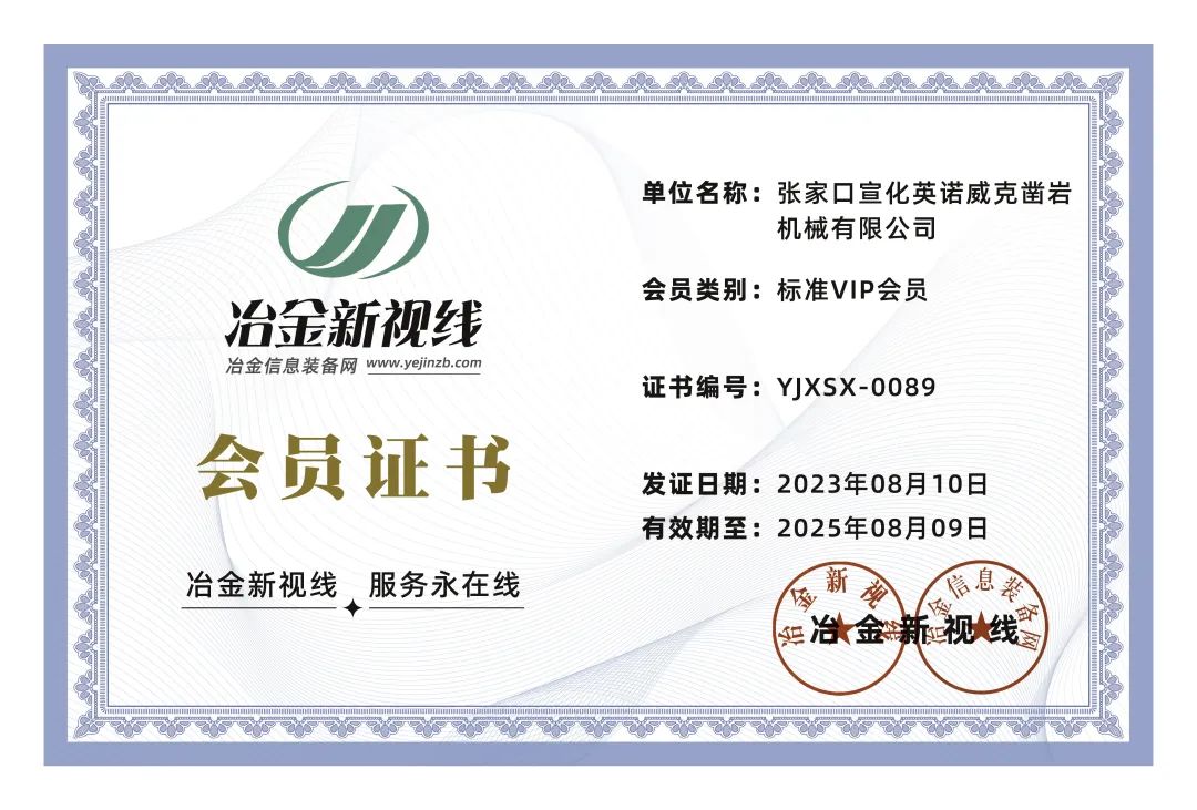 张家口宣化英诺威克凿岩机械有限公司已成功加入冶金新视线标准VIP会员,并将获得为期两年的专业会员服务。成为冶金新视线的VIP会员,意味着张家口宣化英诺威克凿岩机械有限公司已经迈出了成功的第一步。冶金新视线已经为许多VIP会员提供了有价值的服务。通过合作,会员们得到了业务的提升,取得了实实在在的成果。我们期待与张家口宣化英诺威克凿岩机械有限公司一同创造更多的成功案例。
