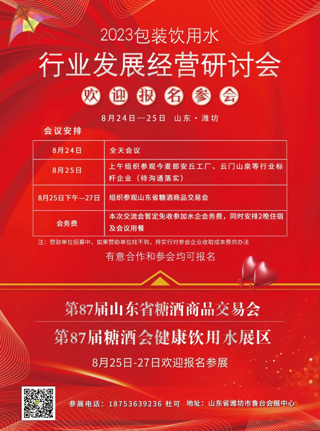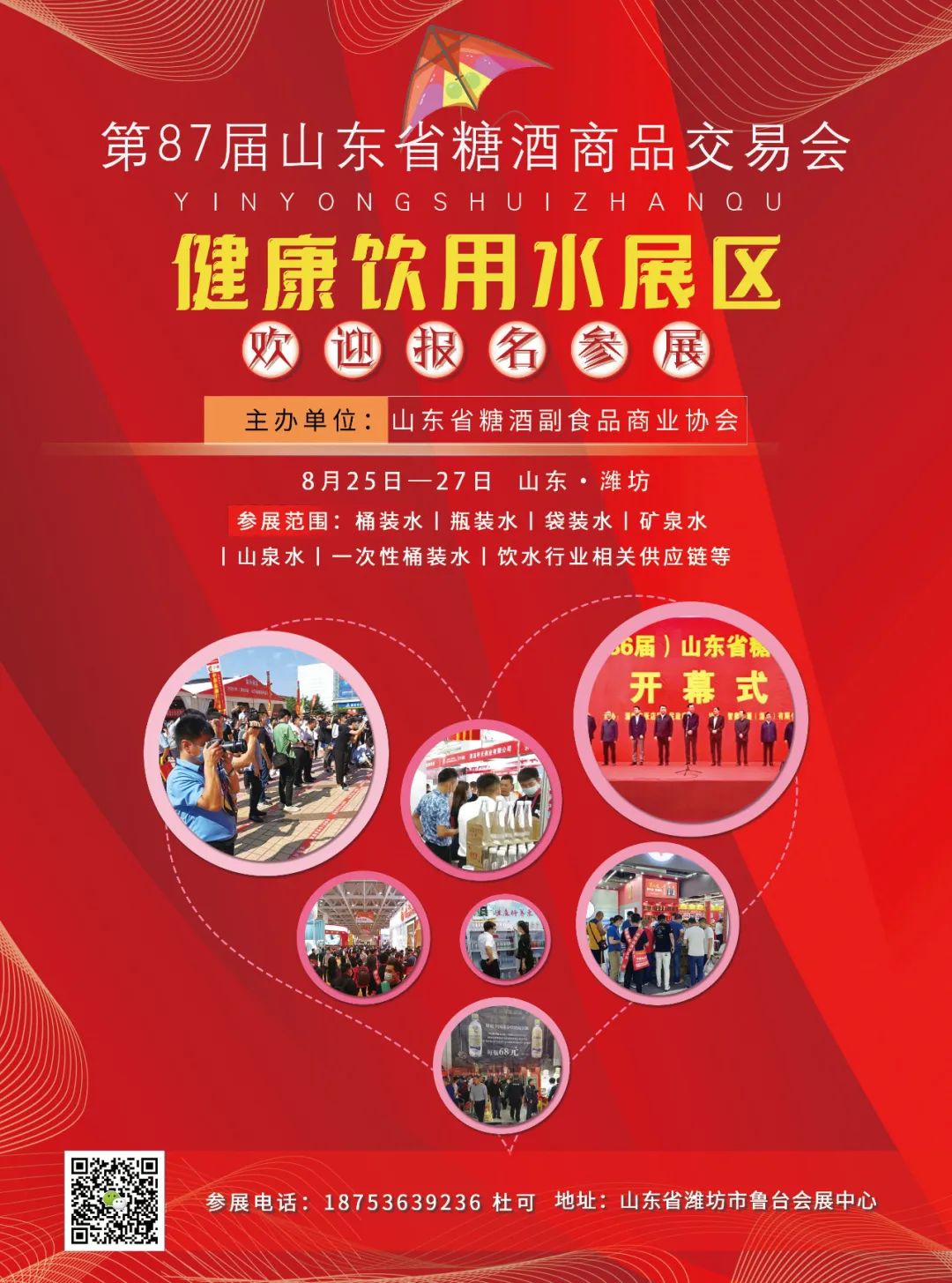 在这里,组委会热忱欢迎全国各地的糖酒食品企业光临盛会,齐聚潍坊,共觅商机、同谋发展!健康饮用水展区诚招饮用水企业及产业链相关企业参会参展。有意参展请尽快联系我们!联系电话:18753639236 联系人:杜可