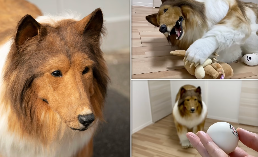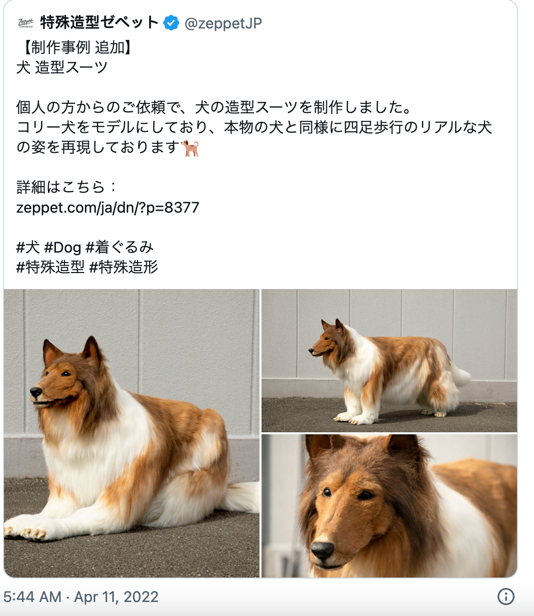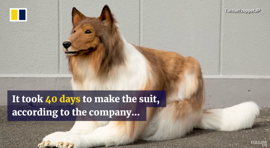 "应一位客户的要求,我们制作了一套狗装模型。该公司写道:"以牧羊犬为模型,它再现了真正的四足狗的逼真外观。