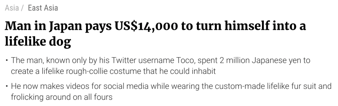 日本一名男子花费 1.4 万美元实现了自己变成四条腿动物的梦想。