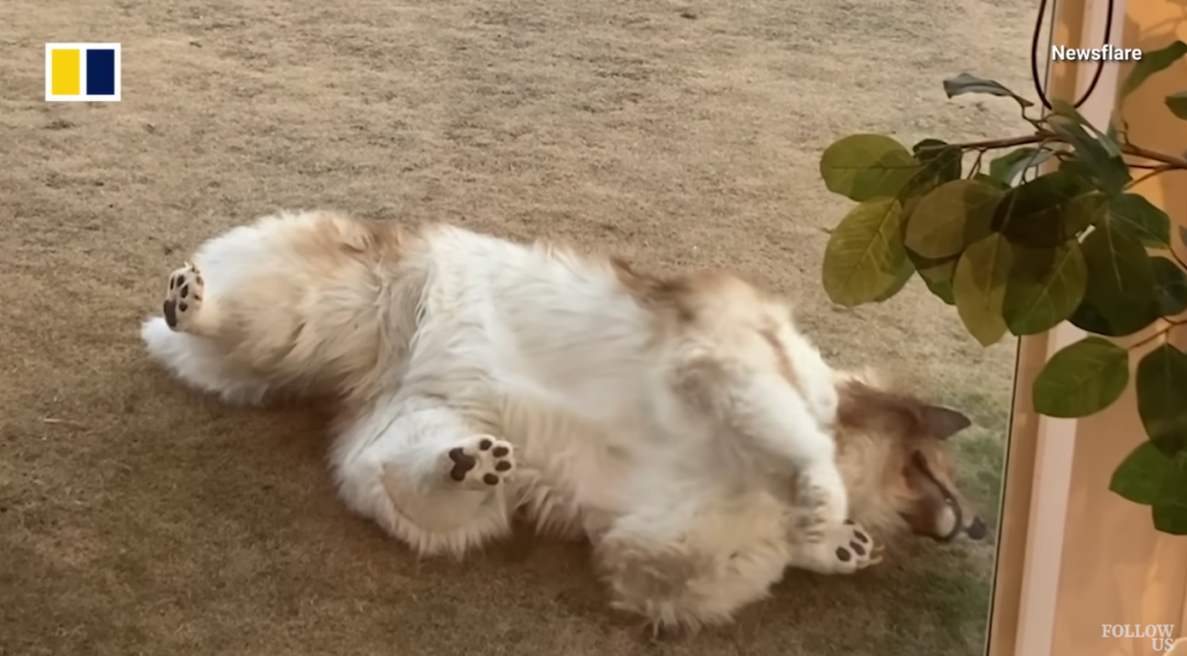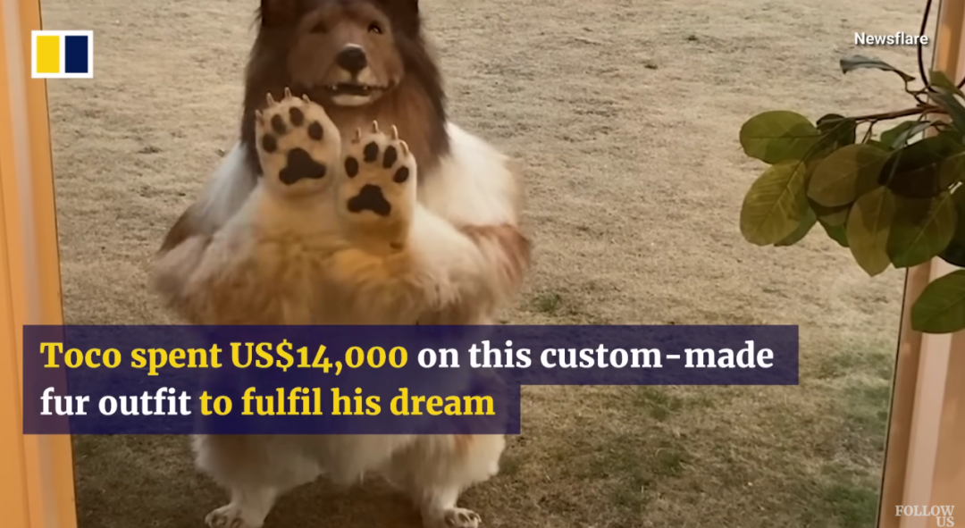 去年 4 月,Toco 在 Twitter 上分享了一段视频,视频中他穿着粗毛狗服装在地上打滚,并用 "爪子 "对着镜头比划。