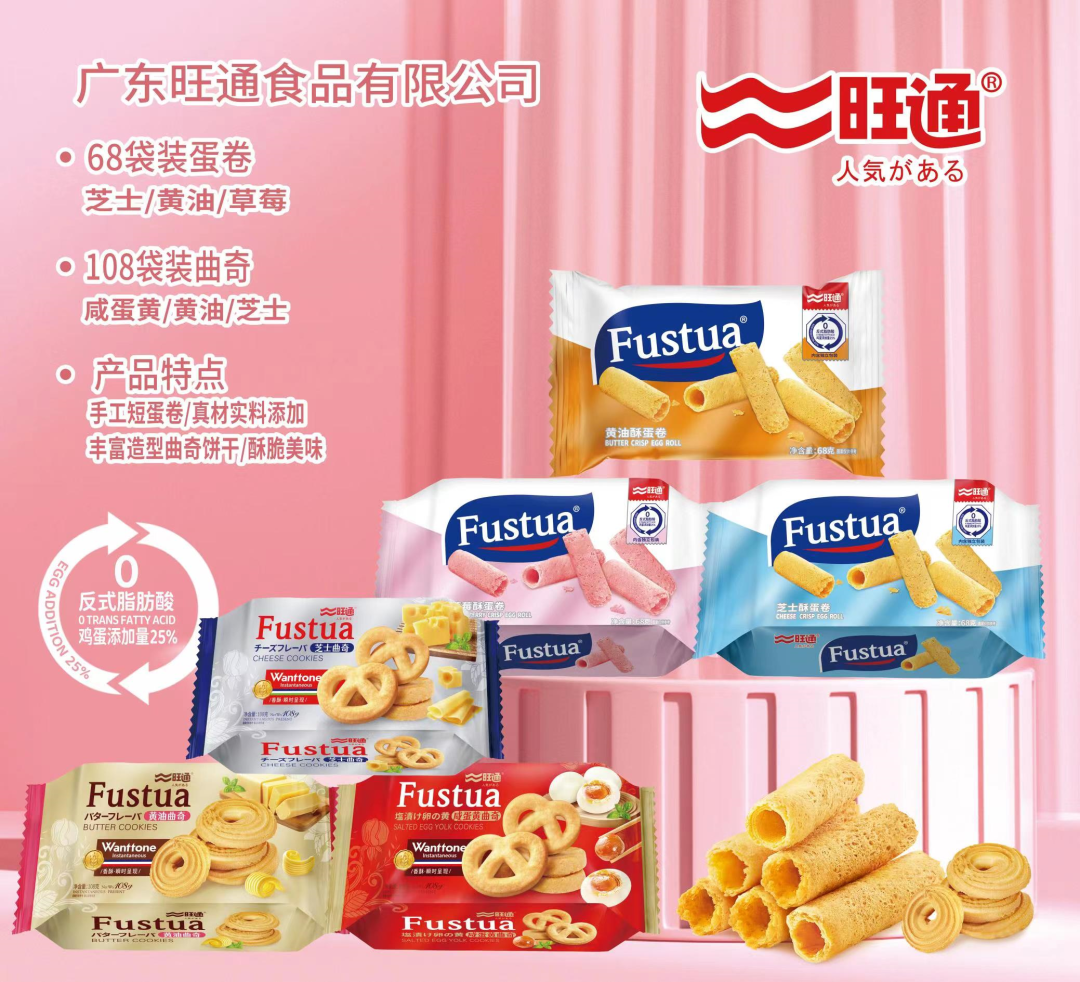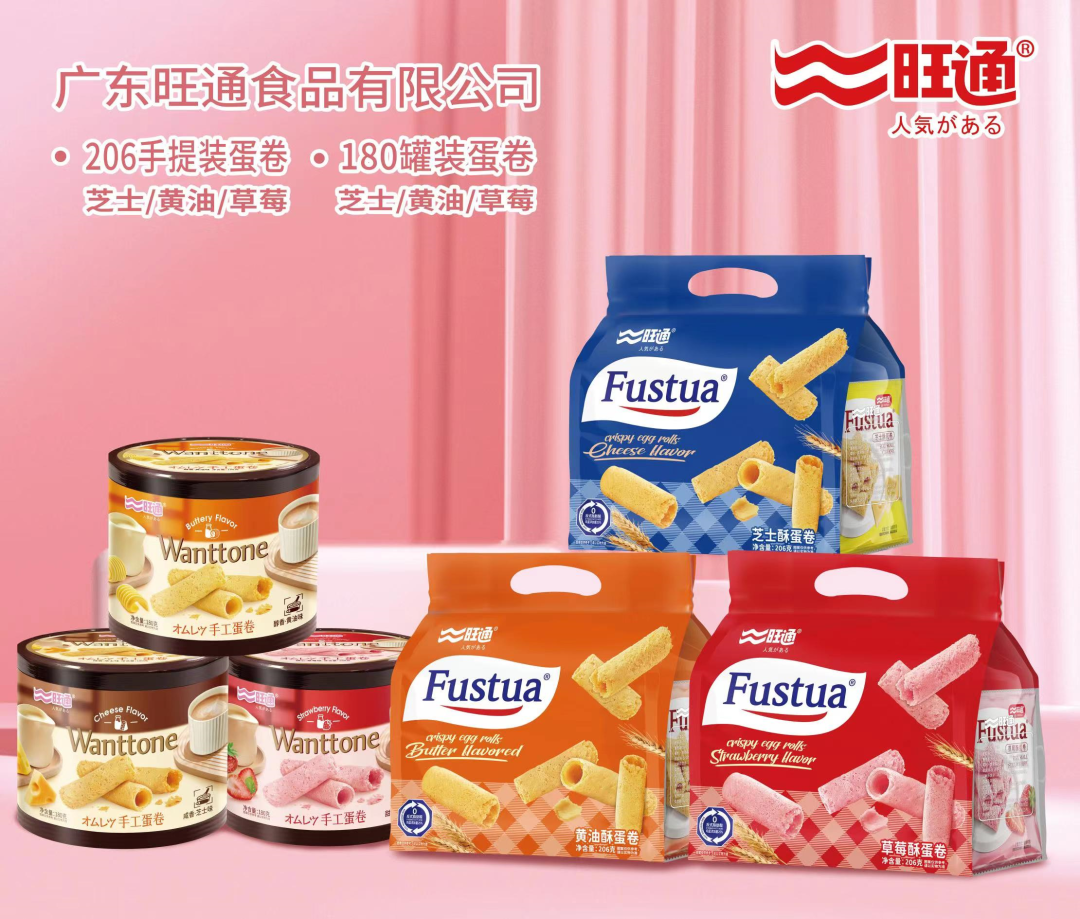 公司简介:旺通食品成立于1996年,总部位于广东幸福城市——阳江市。其中有家喻户晓的手工鸡蛋卷系列、葱油饼系列、广东鸡仔饼系列。近年研发了零添加鸡蛋卷,无添加干湿两吃苞米饼干,双色鸡蛋卷,mini马卡龙,24小时发酵葱油饼等等系列。公司被评为“高新技术企业”,并荣获给养应急保障动员企业,广东老字号烘焙企业,广东省名牌产品,全国食品工业优秀龙头食品企业。多年来,旺通饼干一直以良好的形象和创新的口感为人们所称道。