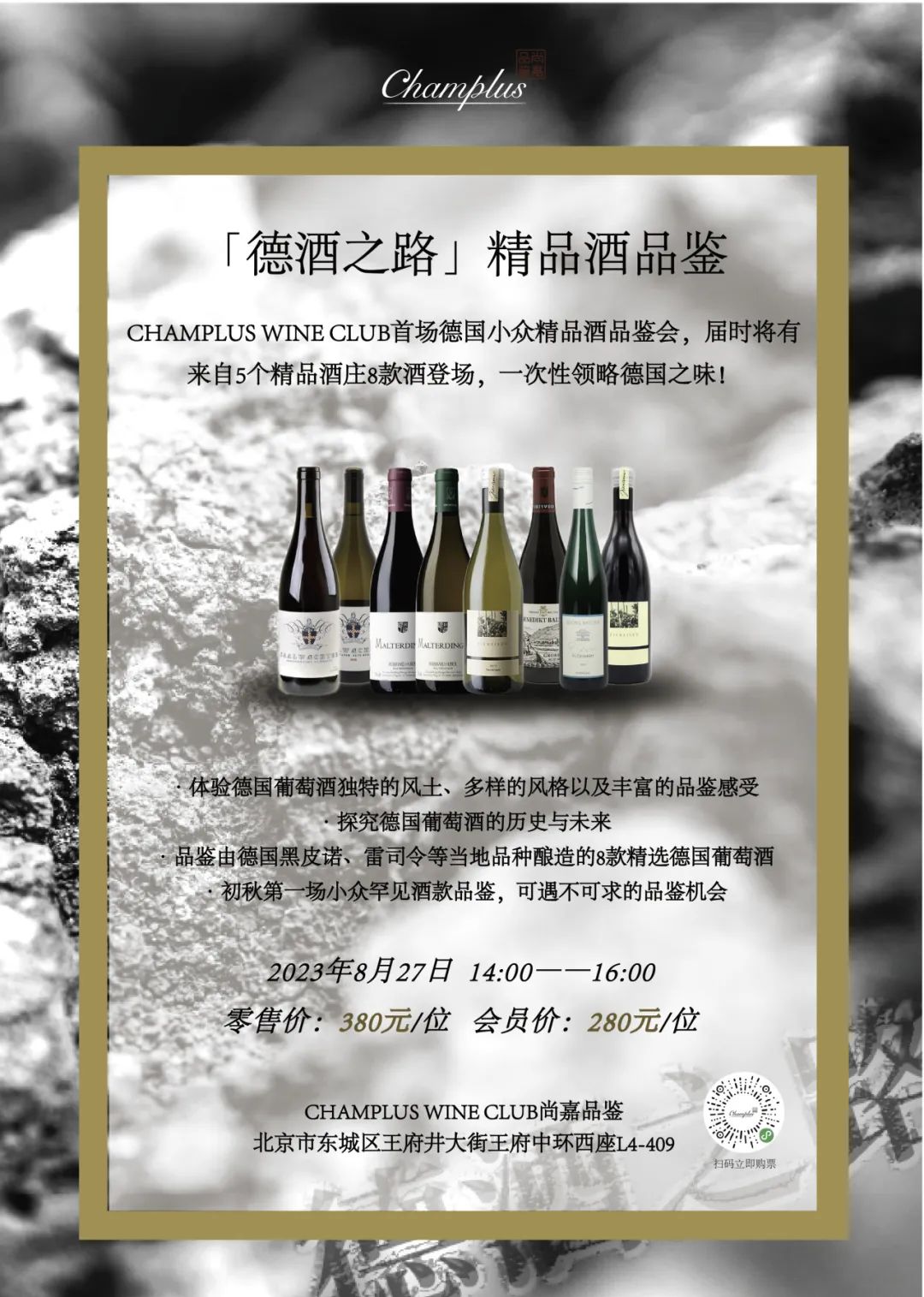 8月27日(周日)下午14:00,CHAMPLUS WINE CLUB为大家带来一场德国小众精品酒品鉴会,邀请了在德国旅居20余年的伟斯曼创始人及总经理刘玉钧为主讲人,届时将有来自5个精品酒庄的8支由当地特色品种酿造的佳酿登场,一次性领略德国之味!