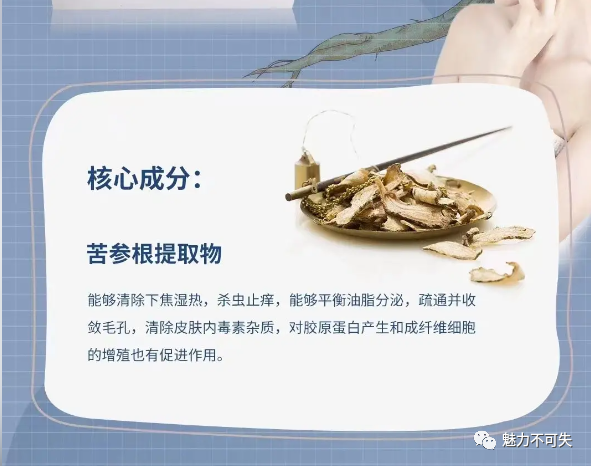能够清除下焦湿热,杀虫止痒,能够平衡油脂分泌,疏通并收敛毛孔,清除皮肤内毒素杂质,对胶原蛋白产生和成纤维细胞的增殖也有促进作用。