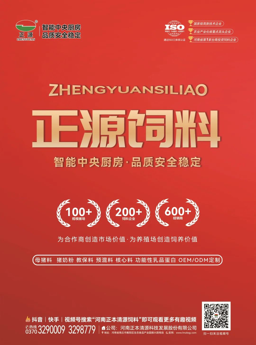 河南正本清源科技发展股份有限公司成立于1999年,公司性质为台港澳与境内合资的股份有限公司,注册资金3050万元。公司经营范围是:饲料产品的研究、开发、生产、代加工、销售。公司2020年被认定为河南省农业产业化重点龙头企业。连续多年被认定为国家高新技术企业,2018年10月被商丘市委市政府评为“优秀成长创新型企业”,2018年11月被商丘市睢阳区政府评为“睢阳区优秀非公有制行业领先型企业”,2022年被省工信厅评为 “ 河南省专精特新中小企业 ”,2022年10月更是通过了ISO9001(质量管理体系)、ISO14001(环境管理体系)、ISO45001(职业健康与安全管理体系)三体系认证。公司十分重视科技创新及对外交流合作,目前已具有自己知识产权计46项,其中发明专利10项。拥有4个省级企业技术研发平台(即省科技厅颁发的猪用无抗生物饲料工程技术研究中心、河南省发改委授予的省级企业技术中心、省教育厅颁发的河南省无抗饲料智能加工产教融合示范基地以及与商丘师范学院共建的生物饲料研发中心),公司与台湾宜兰大学、甘肃农业大学、商丘师范学院等高校或科研院所建立了良好的合作关系,创建有偿合作研发平台。 公司坚持采用“中央厨房标准作业模式”,秉承“今天的饲料就是明天的食品、生产饲料就是生产食品”的经营理念。专注于母猪料、动物奶粉、教保料、预混料、核心料及功能性乳品蛋白的研发与生产。目前与公司定制生产合作的饲料企业超过400家,经销商合作单位600余家,规模养殖合作企业个性化定制业务100余家。2018年11月,位于商丘生态食品产业园初期投资8000万元,年产十八万吨的全自动生产基地竣工投产。新生产基地以设备换芯、生产换线、机器换人的智能化设计理念,五条独立生产线,确保产品在生产过程中无交叉污染。财富热线:0370-3292559 3298779
