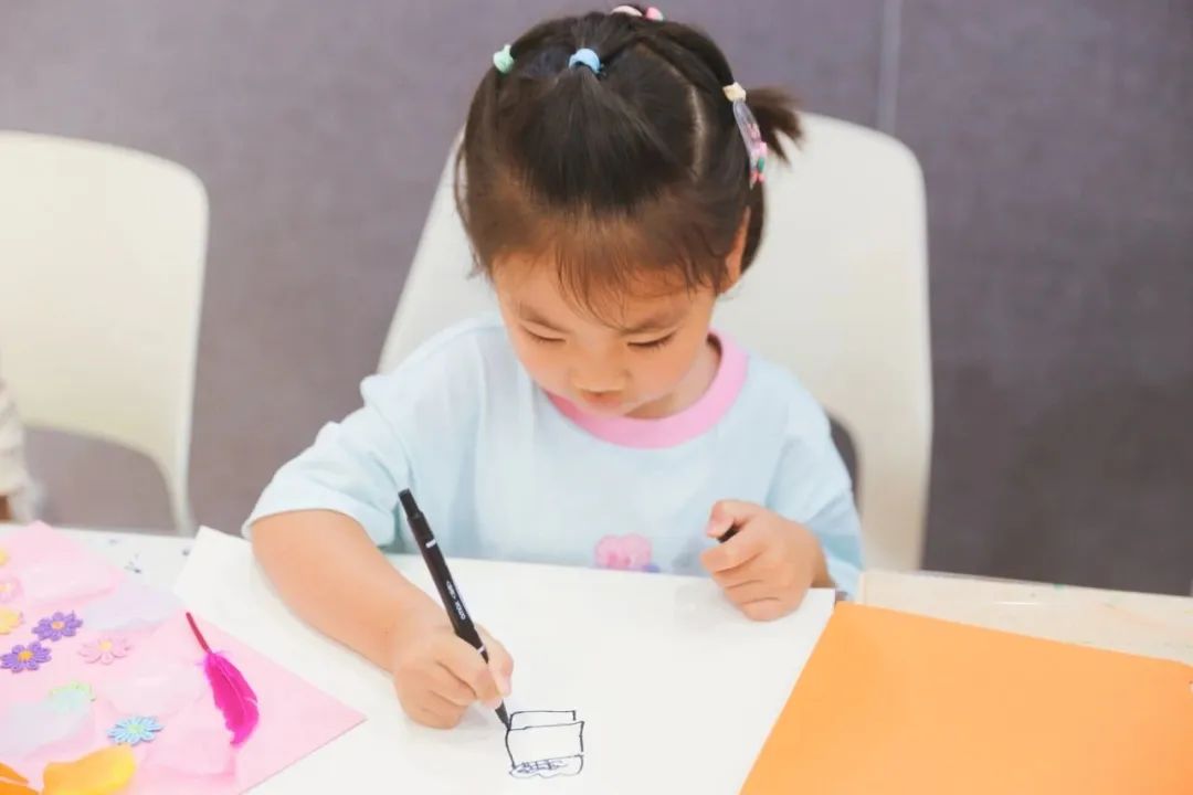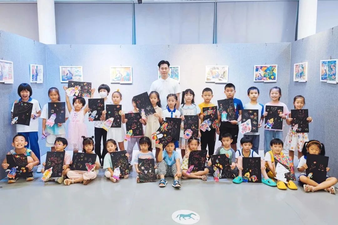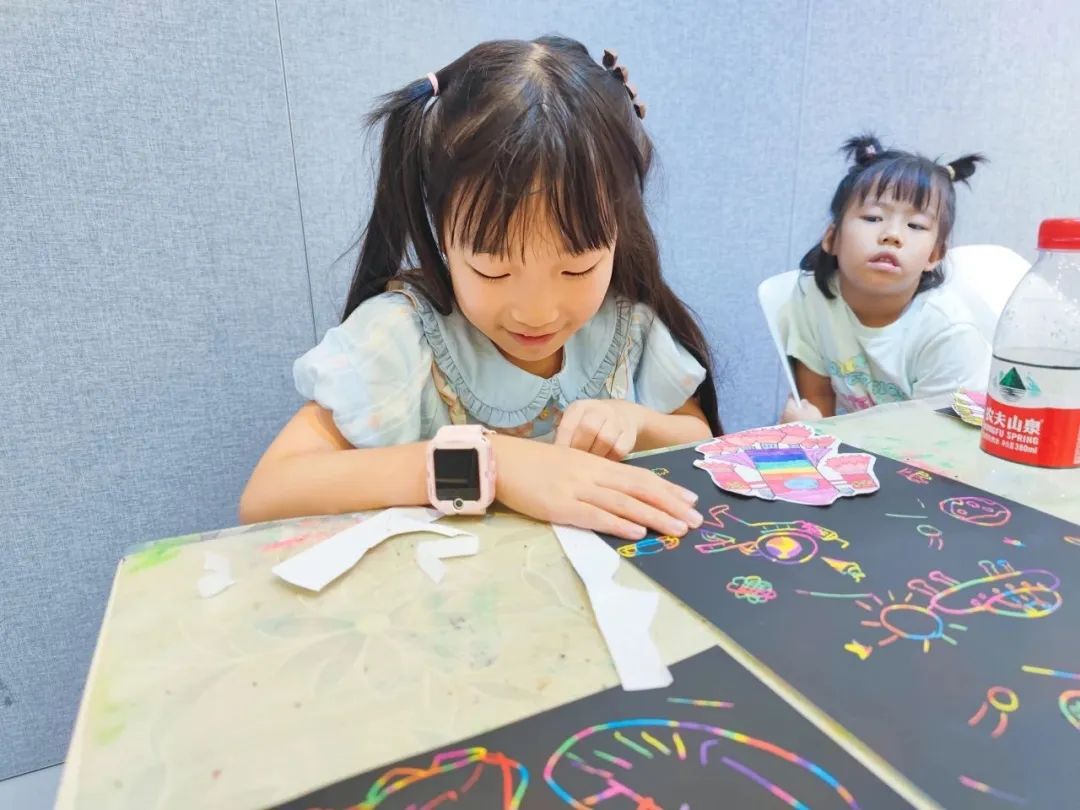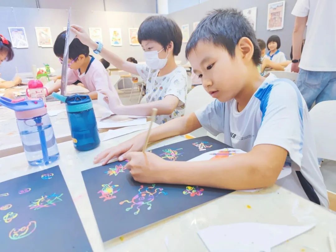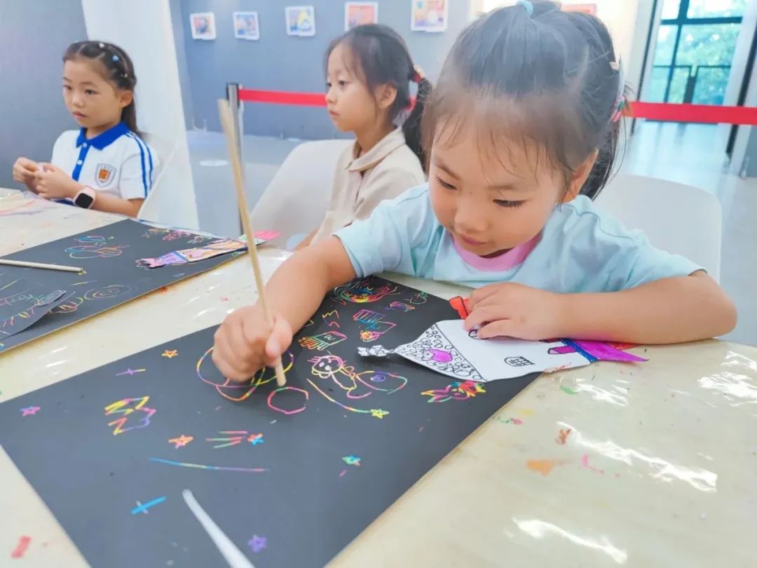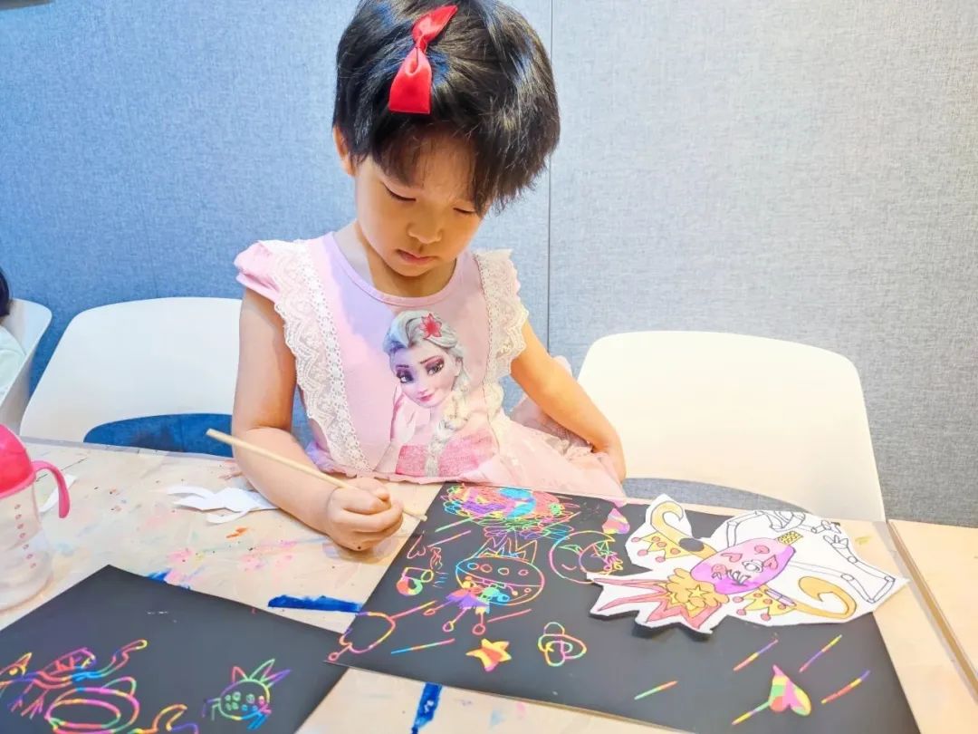 本次活动中,老师带领孩子们一起绘画火箭、星球、星星等,各种各样充满创意的火箭用不同的设计图案创造出来,在绘画出火箭框架的基础上,孩子们用不同颜色的马克笔进行颜色填充,再把画好的火箭剪下来粘贴在刮画纸上,在贴有火箭的刮画纸中,绘画出不同模样的星球,用刮画笔点缀星星点点,让画面更丰富、精彩,此次绘画不仅激发出孩子们的畅想,还激发出孩子们对宇宙探索的积极性。