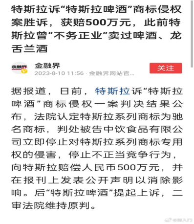 “特斯拉啤酒”败诉 ,根据特斯拉中国介绍,日前特斯拉诉“特斯拉啤酒”商标侵权一案判决结果公布,法院认定特斯拉系列商标为驰名商标,判处被告中饮食品有限公司立即停止对特斯拉系列商标专用权的侵害,停止不正当竞争行为,向特斯拉赔偿人民币500万元,并在报刊上发表公开声明以消除影响。后“特斯拉啤酒”提起上诉,二审法院维持原判。曾几何时酒类市场是傍名牌的重灾区,这个案件对偏好“寻热点、傍大款”的酒类开发商们敲响了警钟 !
