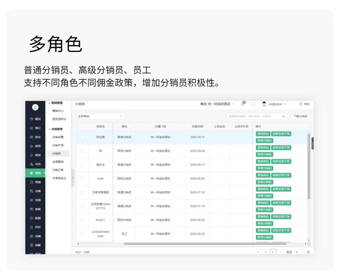 支持设置上下级有效期限,批量转移上下级,分销员角色管理,业绩查询等