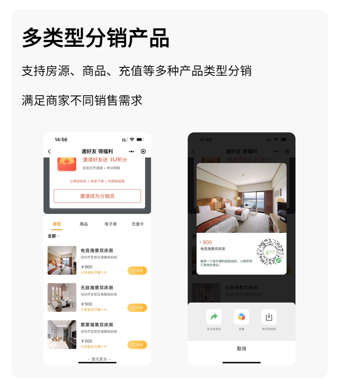 支持房源、商品、预售券、权益会员卡、礼品卡、路线研学、充值等多种产品类型分销,满足商家不同销售需求。