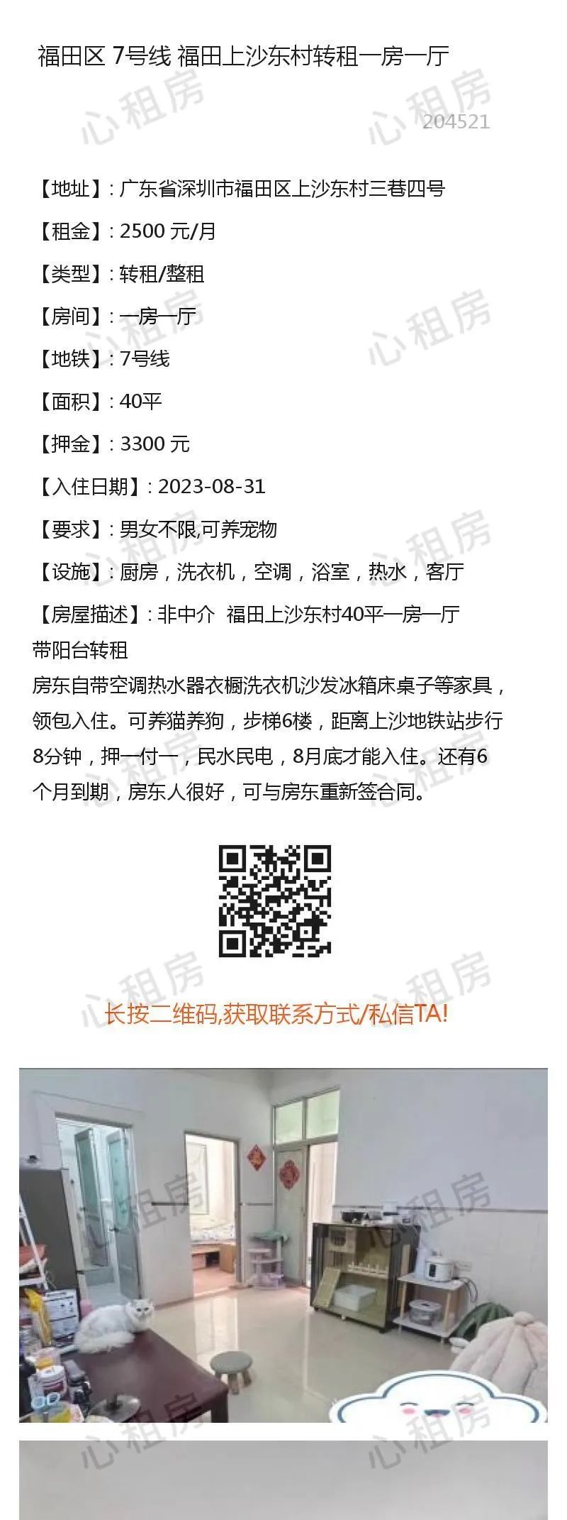 1、所有房源信息均由网友投稿,委托本公众号/心租房(homhere.cn)发布,房源的真实性、合法性由提供者负责。2、请务必核实双方身份信息(身份证)、房产权属(产权证明)、转租权利(租赁合同)等基本信息。3、请务必实地考察房源并确保与出租方提供的基本信息一致。4、切勿轻易支付定金、保证金、打赏等,建议签订《租赁合同》后再进行交易。5、双方在房屋租赁过程中产生的一切纠纷,均与本公众号/心租房(homhere.cn)无关。6、近期有人冒充我方线下工作人员,在此特别提醒:本公众号/心租房(homhere.cn)仅提供信息发布,不存在线下工作人员提供服务,请务必谨慎、切勿上当被骗。7、切勿轻信他人,点击他人提供的链接、二维码等,切勿按照他人指示提供验证码、进行转账等操作,谨防上当受骗。8、如遇提供虚假信息、冒充我方工作人员、引诱点击其他网站链接、实施诈骗等行为的,请及时在本公众号对话框里回复:Y,与我方客服联系。