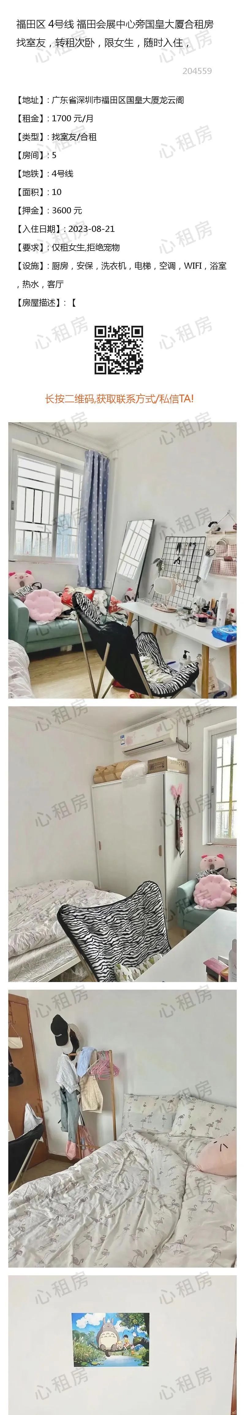 深圳心租房【福田4则】房源①:4号线福田会展中心旁国皇大厦合租房找室友转租次卧1700元/月;房源②:.........