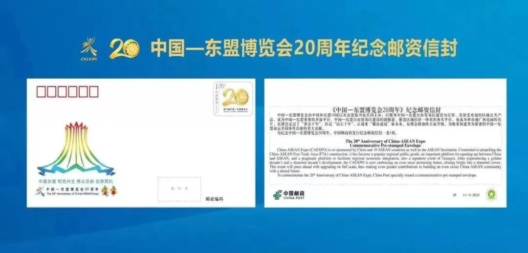 中国邮政定于2023年9月16日发行JF145《中国-东盟博览会20周年》纪念邮资信封一套1枚,邮资图规格为37×28.5毫米,面值为1.20元,售价1.60元。陈景异设计。发行量为68.5万枚。