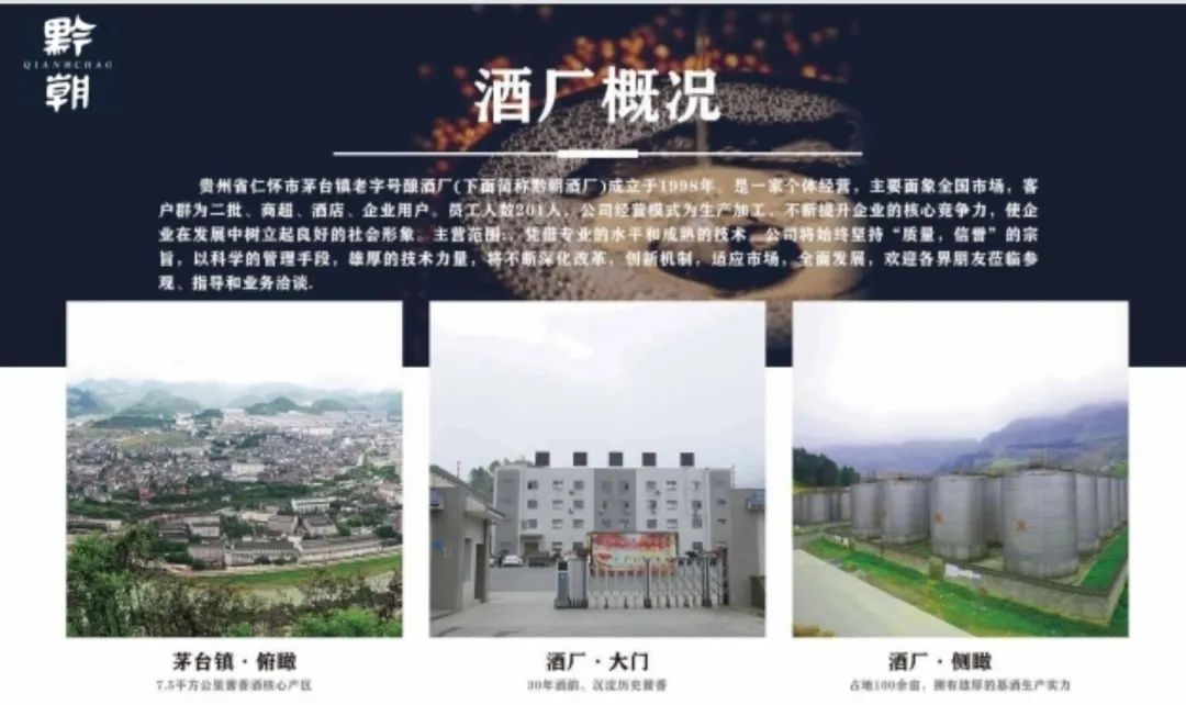 贵州大黔朝酒业集团成立于茅台镇酱香酒发源地。黔朝酒厂成立于1998年,是一家集酱酒研发、生产、销售、服务于一体化的现代化综合新型企业。黔朝酒厂大小酒库共20多个,大型酒罐80个,库存老酒坛装5200多坛。分别有成品酒库、30年以上基酒酒库,20年老酒酒库、藏酒洞酒库、10年老酒酒库等不同功能不同年份的酒库类型。