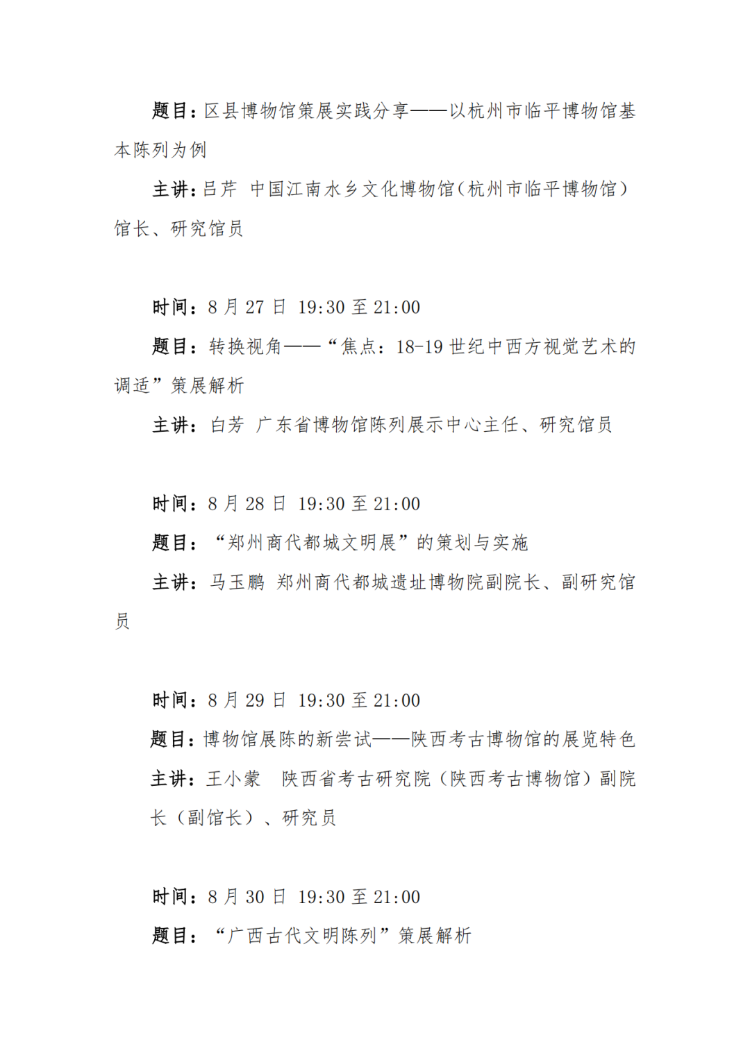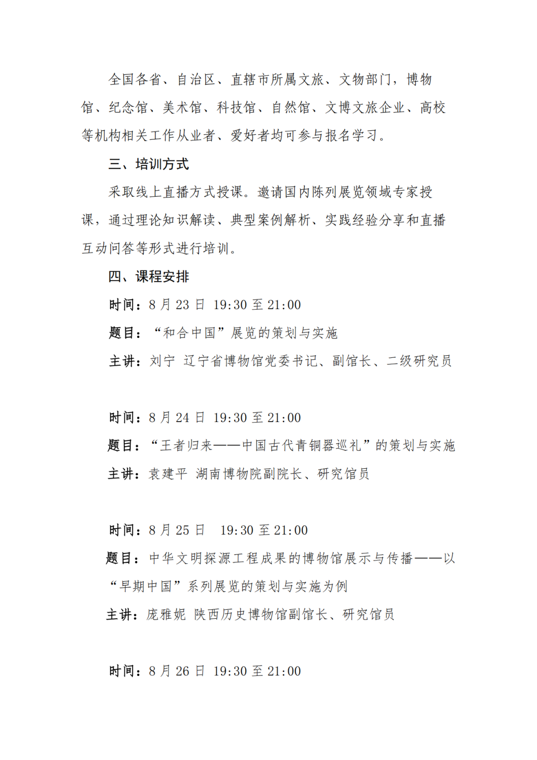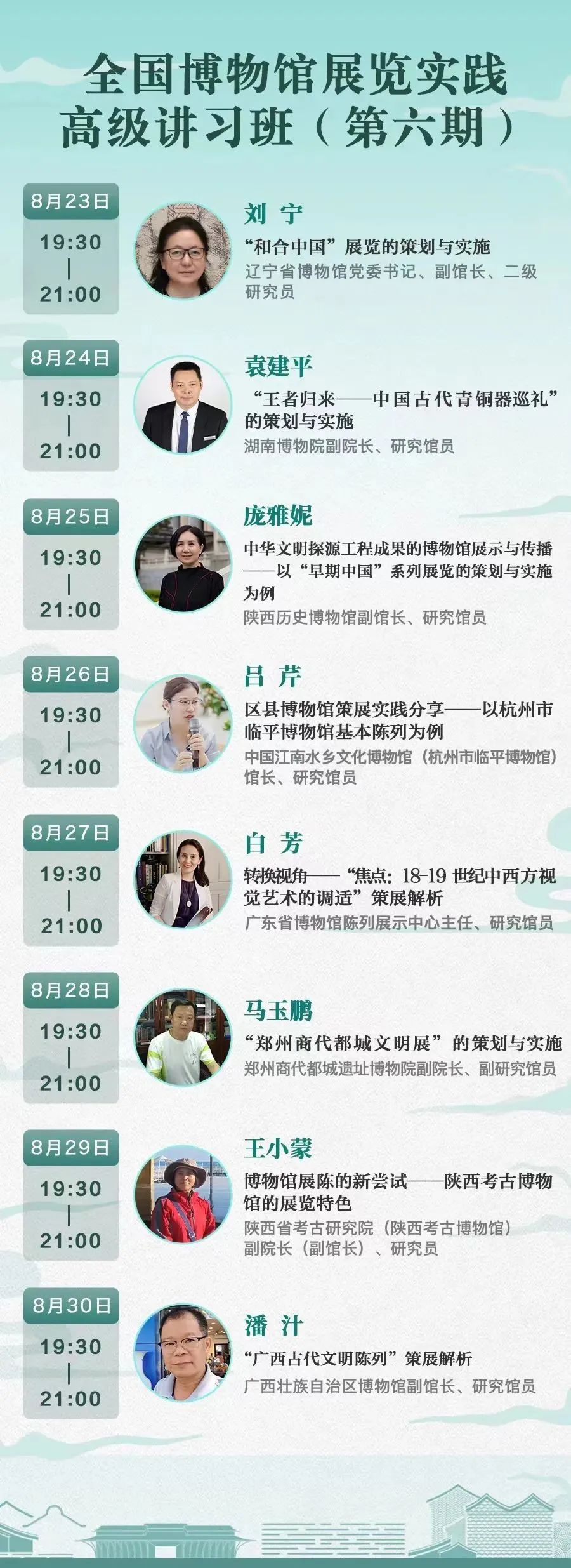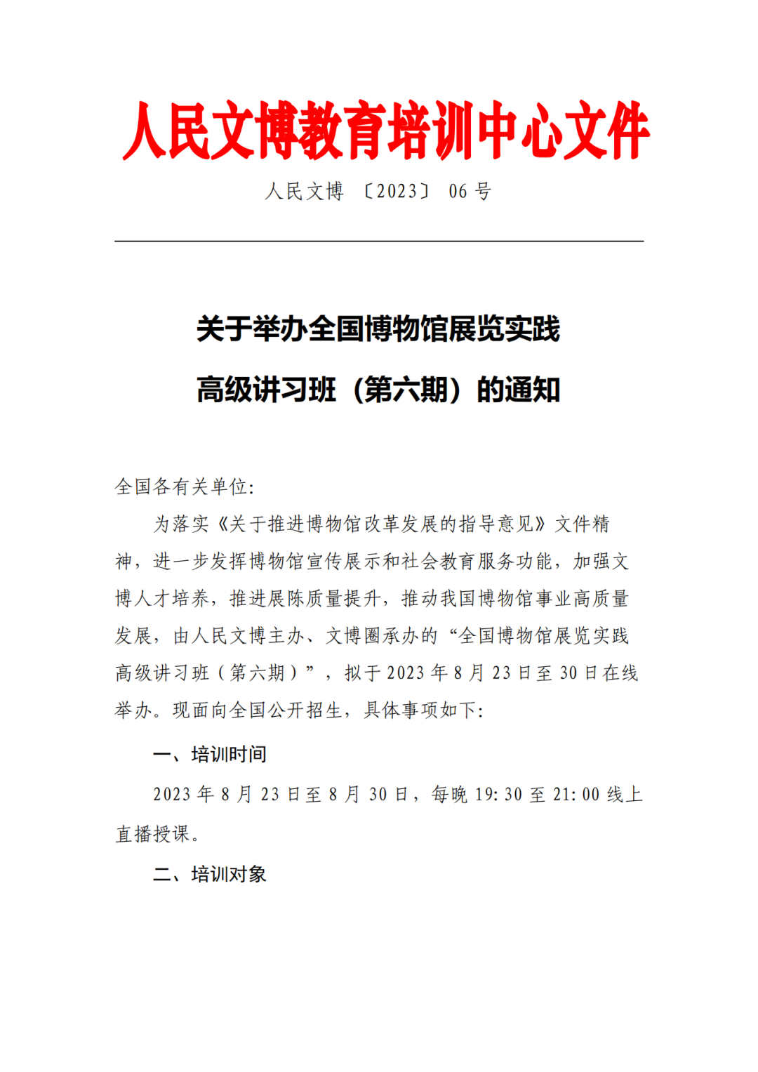 为落实《关于推进博物馆改革发展的指导意见》文件精神,进一步发挥博物馆宣传展示和社会教育服务功能,加强文博人才培养,推进展陈质量提升,推动我国博物馆事业高质量发展,由人民文博主办、文博圈承办的“全国博物馆展览实践高级讲习班(第六期)”,拟于2023年8月23日至30日在线举办。现面向全国公开招生,具体事项如下:2023年8月23日至30日,每晚19:30至21:00线上直播授课。全国各省、自治区、直辖市所属文旅、文物部门,博物馆、纪念馆、美术馆、科技馆、自然馆、文博文旅企业、高校等机构相关工作从业者、爱好者均可参与报名学习。采取线上直播方式授课。邀请国内陈列展览领域专家授课,通过理论知识解读、典型案例解析、实践经验分享和直播互动问答等形式进行培训。主讲:刘宁 辽宁省博物馆党委书记、副馆长、二级研究员题目:“王者归来——中国古代青铜器巡礼”的策划与实施题目:中华文明探源工程成果的博物馆展示与传播——以“早期中国”系列展览的策划与实施为例题目:区县博物馆策展实践分享——以杭州市临平博物馆基本陈列为例主讲:吕芹 中国江南水乡文化博物馆(杭州市临平博物馆)馆长、研究馆员题目:转换视角——“焦点:18-19世纪中西方视觉艺术的调适”策展解析主讲:白芳 广东省博物馆陈列展示中心主任、研究馆员主讲:马玉鹏 郑州商代都城遗址博物院副院长、副研究馆员题目:博物馆展陈的新尝试——陕西考古博物馆的展览特色主讲:王小蒙 陕西省考古研究院(陕西考古博物馆)副院长(副馆长)、研究员五、结业证书