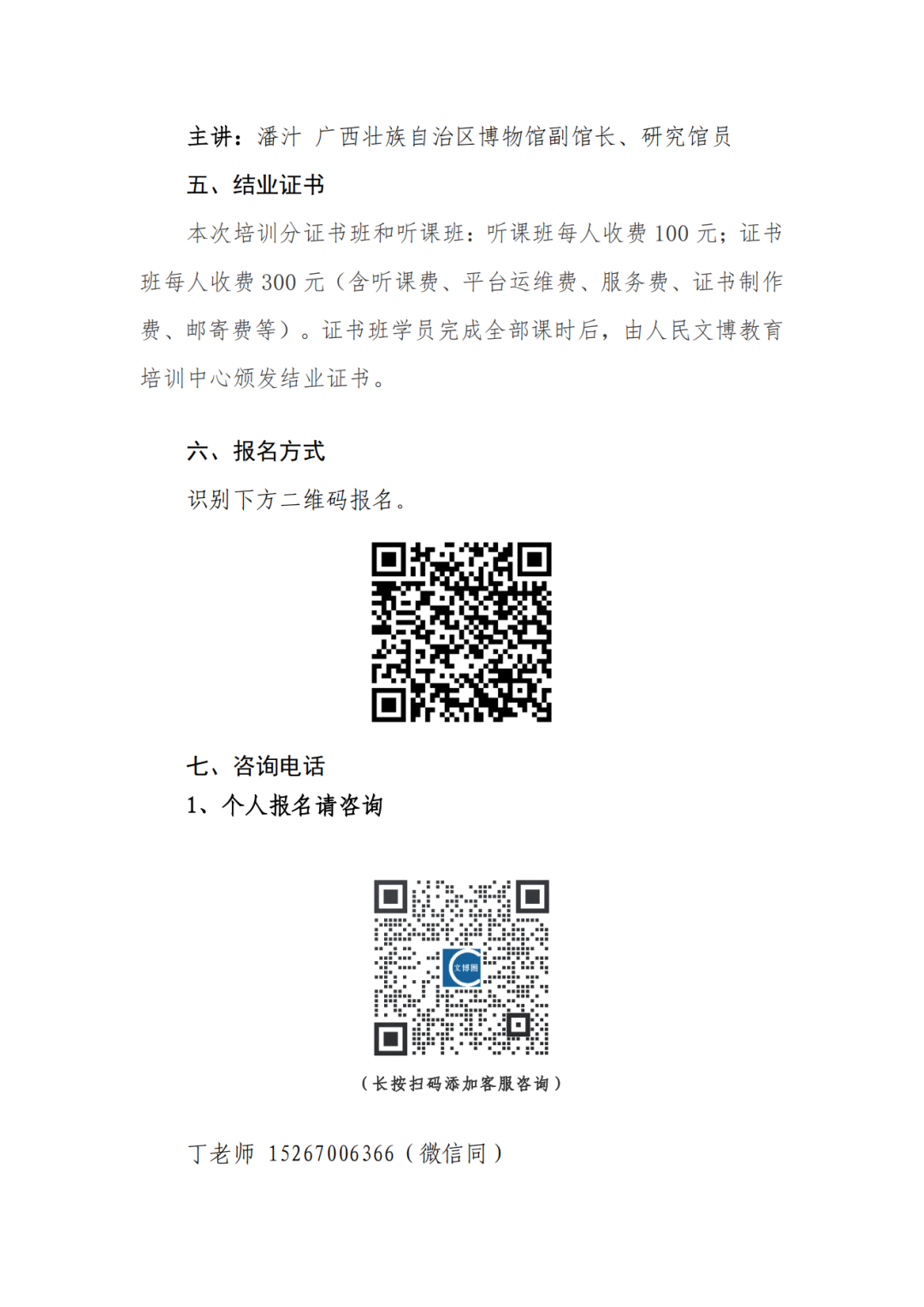 本次培训分证书班和听课班:听课班每人收费100元;证书班每人收费300元(含听课费、平台运维费、服务费、证书制作费、邮寄费等)。证书班学员完成全部课时后,由人民文博教育培训中心颁发结业证书。扫码下载通知原文件
