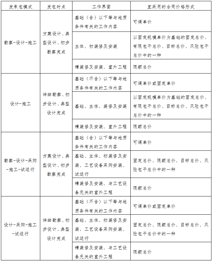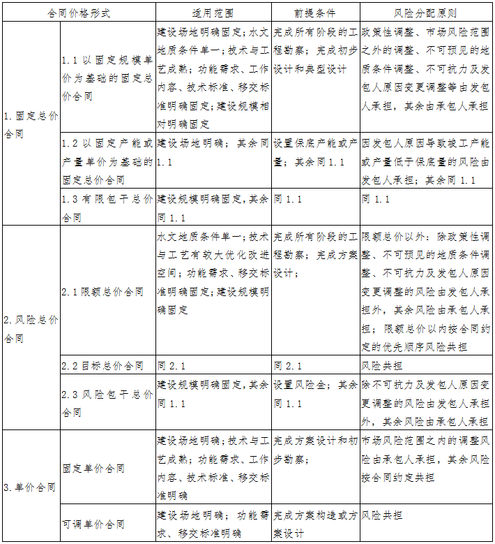 近年来,随着国家对全过程工程咨询和工程总承包模式的大力推行,工程总承包模式广泛用于各行业、各领域,但相应配套的具有可操作性的政策法规较为滞后,尤其缺乏合同价格形式的指导性实施细则。本文作者结合多年工程总承包的从业经验,从项目全生命周期角度,遵循公平、公正、实事求是的原则,对工程总承包模式下建设项目的合同价格形式、风险分配原则进行了深入研究,提出了解决方案。 近二十年来,国家、相关行政主管部门及相关行业对工程总承包分别多次出台相关文件。工程总承包模式的内容演变如下表1所示。 从上述演变过程中可以分析得知,建设部及地方行政主管部门的工程总承包法规制度文件逐步将“勘察”去除,但也并未明确禁止将勘察纳入工程总承包范围。鉴于勘察是设计工作的前提和基础,且不可预见的地质条件属于建设单位或发包人承担的风险范围,是否将勘察纳入工程总承包范围,应根据项目实际因事而定,不能一概而论、以偏概全。 根据《岩土工程勘察规范》及相关专业的勘察规程规定,勘察阶段可划分为:可行性研究、初步勘察、详细勘察三阶段或初步勘察、详细勘察两阶段。 与勘察阶段相对应的设计阶段包括可行性研究或方案设计、初步设计、施工图设计三阶段,或方案设计、施工图设计两个阶段。 现阶段,为了避免勘察风险分配不合理产生合同执行争议,在地方行政监管层面,倾向于勘察工作不纳入工程总承包发承包范围。如《四川省房屋建筑和市政工程标准设计施工总承包招标文件》(2021年版)要求:“招标人应在完成勘察工作后进行工程总承包项目发包,不得将勘察纳入工程总承包招标范围一并发包”。但从《建筑法》等法律文件来看,在风险合理分担原则下采用合理的合同价格形式,将设计工作和相应阶段的勘察工作纳入工程总承包范围一并发包符合上位法的法律规定,但应遵从《建设工程质量管理条例》第五条:先勘察、后设计、再施工的原则。 在具体实践中,最具争议的是岩土工程设计工作应如何划分发承包界面。从资质管理和行业管理角度,岩土工程设计属于勘察范畴,但其工作本身应按设计工作对待。鉴于基于勘察成果、上部基础结构设计选型与计算的地基处理设计、边坡支护设计等岩土工程设计与基础工程(包括路基)、基坑工程等后续主体工程的设计与造价密不可分,一般情况下,宜将与设计阶段相对应的岩土工程设计工作纳入工程总承包范围一并发包,从而达到合理分配风险、控制投资、加快项目进度的目的。 因此,四川省标准招标文件中“不得将勘察纳入工程总承包招标范围一并发包”中的“勘察”应理解为仅限于招标人发包前应完成的水文地质、工程地质、地形等工程勘察,而不是包含岩土工程设计在内的所有勘察。该标准招标文件是地方行政主管部门的市场化行业管理手段,发包人有权根据法律规定,选择适合项目实际的发承包模式。 建设工程以资产属性可划分为以土木工程等不动产投资为主的建设工程和以工艺设备等动产投资为主的建设工程两大类。前者投资管理的重点是建设与运营(行)过程中的资源消耗综合成本支出;后者投资管理的重点是单位产出效益价值[注1]。 建设工程以项目经营属性可划分为经营性项目(含准经营性项目)和非经营性项目两大类。经营性项目投资管理的重点是经营效益价值[注2],非经营项目投资管理的重点是社会效益价值[注3]。 管理者应从项目全生命周期的角度,综合考虑项目产出与成本支出的价值关系,从而合理确定项目投资规模和进度的控制目标与计划,进而选择适合项目实际的工程总承包模式。 工程总承包模式的核心和前提包括:(1)项目前期策划和决策的依据充足、论证充分,技术准备全面科学合理;(2)合理确定投资控制目标;(3)建立社会诚信管控体系和争议调解机制,各方主体遵守契约精神。 建设单位或发包人应在合理的合同价格形式与风险分配方案的基础上,按照法律法规规定的发包时点和程序,选择符合项目实际和行业管理规定的勘察、设计、采购、施工和试运行全过程或若干阶段承包的工程总承包模式,以达到节约资源、切实提高建设效率、多方共赢的目的。 根据《民法典》及相关法律法规的规定,结合工程总承包的发承包模式,可采用以下合同价格形式。 ①以固定规模单价为基础的固定总价合同。如:房屋建筑工程以单位面积单价为固定单价,按竣工建筑面积计量的总价合同;公路工程以单位里程单价为固定单价,按竣工里程计量的总价合同; ②以固定产能或产量单价为基础的固定总价合同。如:分布式光伏发电工程以单位MW发电量单价为固定单价,按竣工产能总量计量的总价合同; ①限额总价合同:限额总价以内按合同约定的规则结算,结算总价超过限额总价的风险由承包人承担; ②目标总价合同:以合同约定的目标总价为基础和投资控制标准,按合同约定的计量计价规则结算,结算金额与目标总价相比较,超过部分发承包双方按合同约定比例共担,节约部分按合同约定比例共享; ③风险包干总价合同:发包人给予承包人一定的风险金列入合同总价,总价包干。 ①固定单价合同:实物工程量清单单价通过竞争方式形成合同单价,清单单价之外的变更按合同约定的计价规则形成变更单价;结算工程量按合同约定的规则计算; ②可调单价