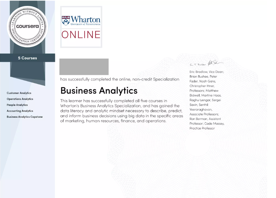 DBC职梦Sophia导师曾成功转岗Data岗位,从0 Offer逆袭,收获来自投行、商行和医药公司的3张Offer。她建议非STEM专业的留学生“转岗商业分析或者数学分析,是性价比很高的留澳方式“。全球顶尖的沃顿商学院针对想要转行商业分析或数据分析的商科生,专门上线了一门课程:Business Analytics Specialization。- 证书含金量很高!可写入简历或挂LinkedIn上展示。