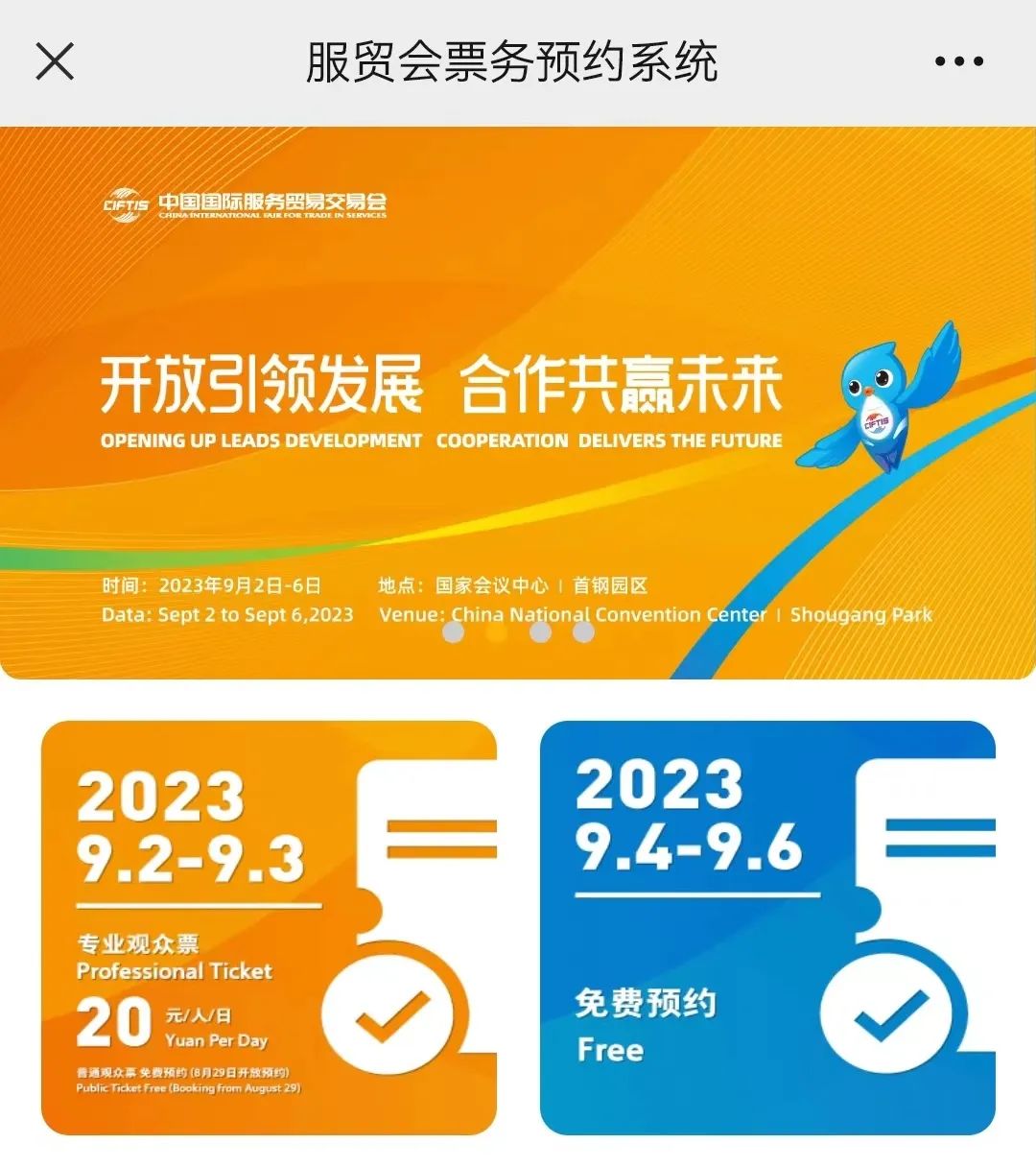 小编温馨提示:本次“服贸会”参观时间为9月2日—5日9:00-17:00,16:00观展人员停止入场;9月6日9:00-16:00,15:00观展人员停止入场。