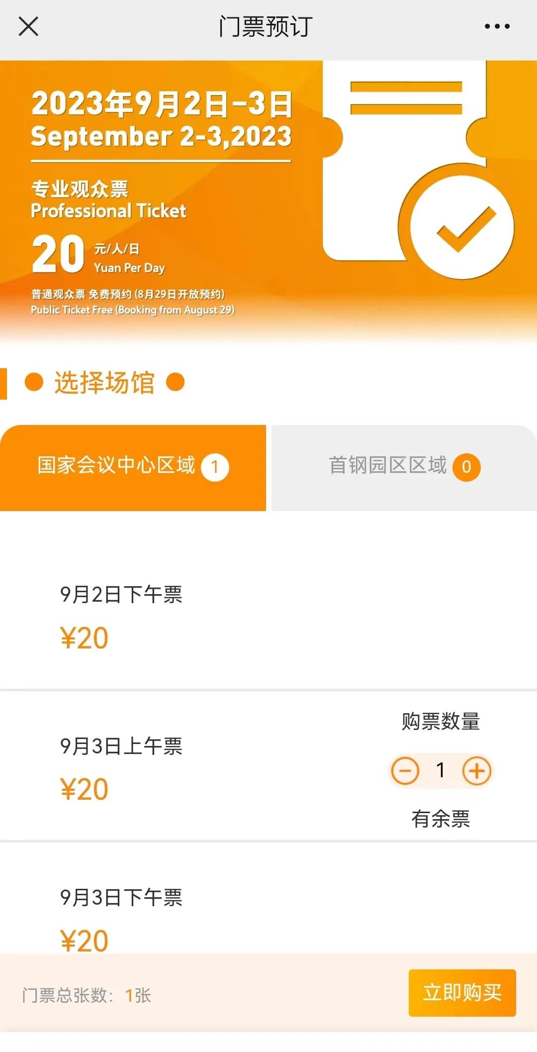 进入服贸会票务预约系统,根据自己的需求以及时间选择“9.2-9.3专业观众票”或“9.4-9.6免费预约”。