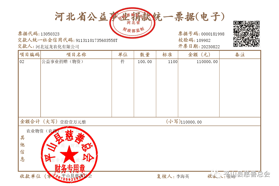 2023年8月22日,平山县慈善总会收到河北冠龙农化有限公司捐赠价值11万元的农资物品,该物资将用于推动平山县农业事业发展,助力乡村振兴。感谢贵单位对平山县慈善事业的支持和关注,在以后的工作当中我们秉承公开、透明、高效的原则,竭力为广大爱心单位和社会群众做好服务!