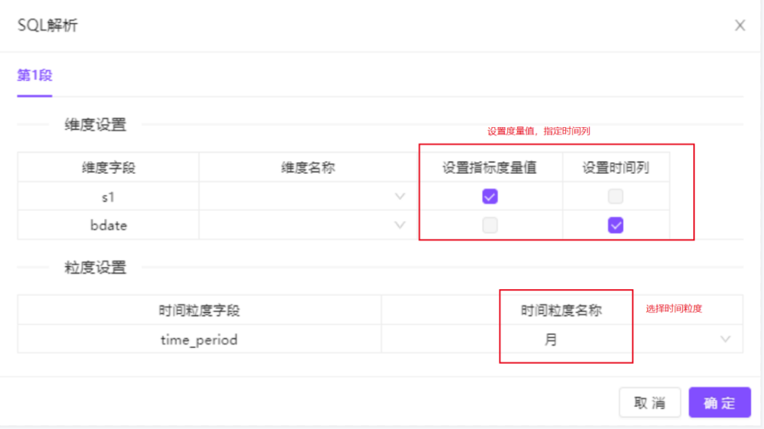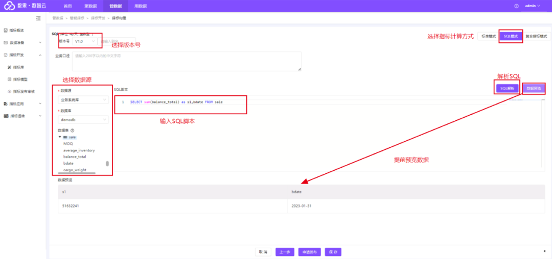 通过选择版本号,关联数据表,输入SQL脚本,设置度量及时间列等完成指标的技术定义。