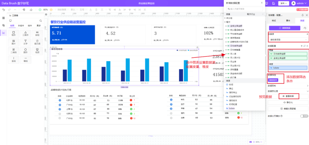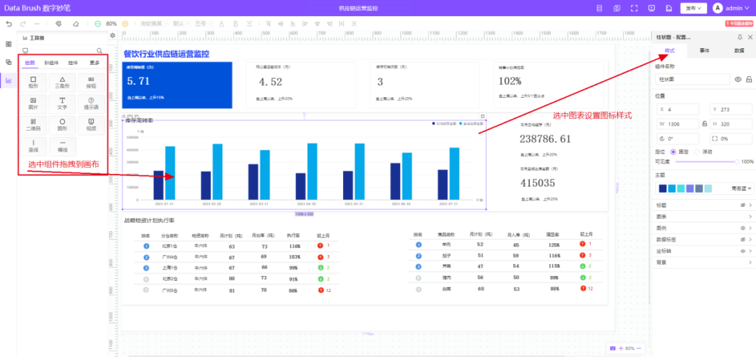 数字妙笔(Data Brush)为客户提供了丰富的可视化组件、控件,无需复杂的操作,只需要通过鼠标拖拽组件到画布并设置事件,配置指标数据,即可实现供应链运营监控可视化界面应用的快速搭建。
