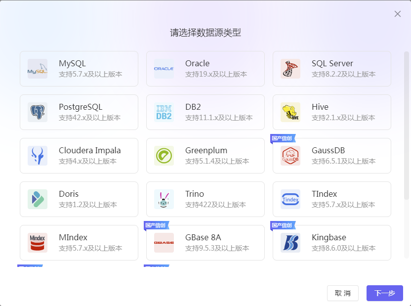 利用数智云平台的数据源管理功能,我们可以快速创建各种业务数据库的连接,并导入多种数据源,数智云平台支持MySQL、Oracle等17种国内外常见的数据库,更提供了达梦、GBASE等国产信创数据库的支持。