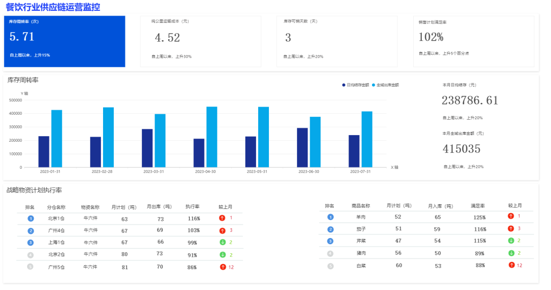 战略物资执行率:它深度体现了企业供应链重点物资的管理能力、对企业的经营稳定性和供需平衡以及品牌价值和业务发展等方面具有较大的帮助。