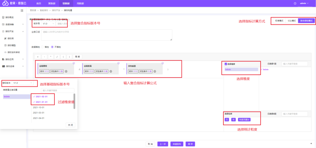 通过选择版本号、维度、统计粒度,输入计算公式,过滤维度值等完成指标的技术定义。