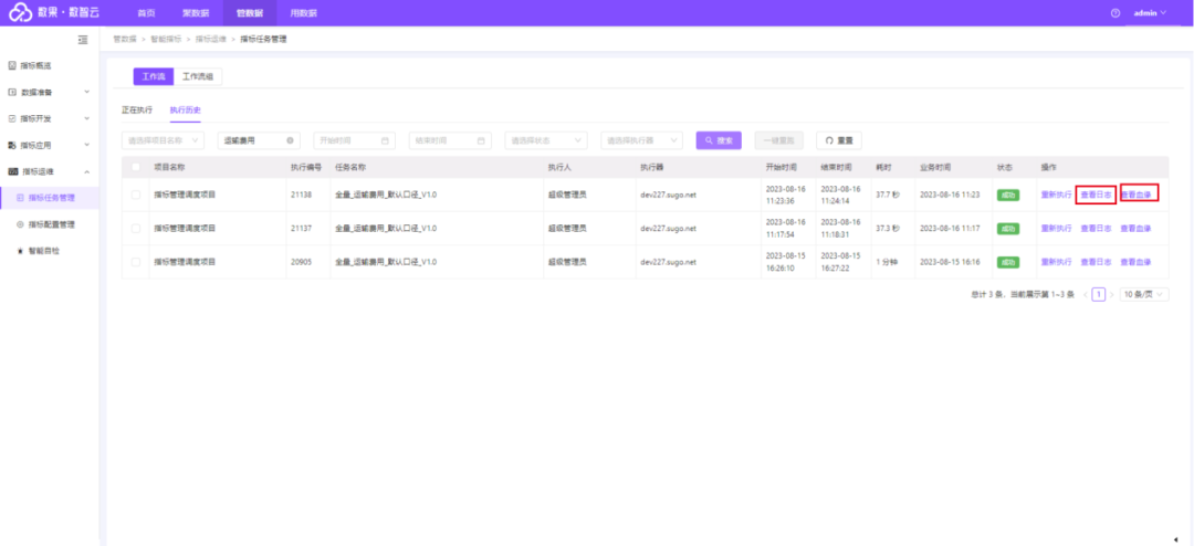 在数智云平台的指标任务管理模块,我们可以随时查看指标任务执行状态、执行日志、血缘等信息。