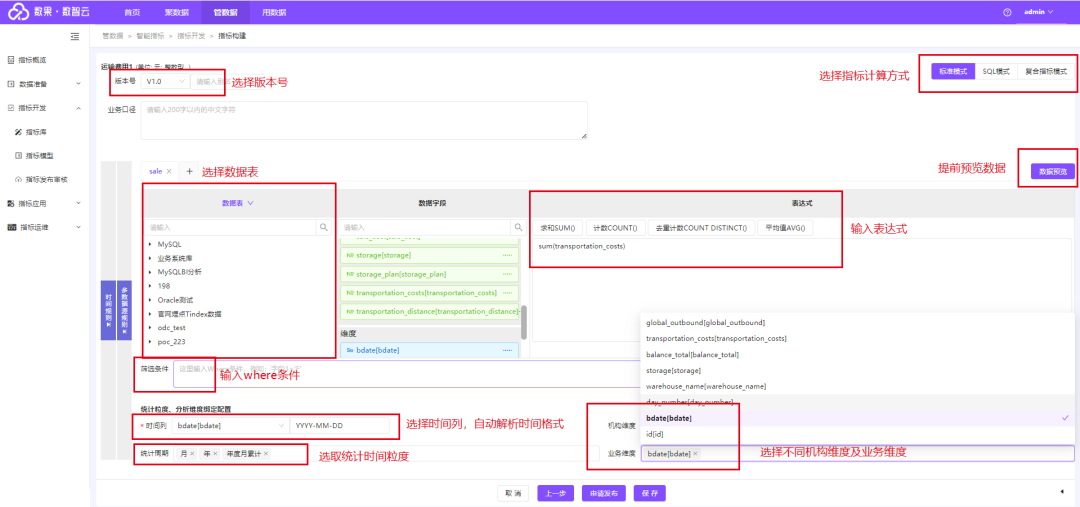 通过选择版本号,关联数据表,输入表达式,选择时间列、统计周期、业务维度等完成指标的技术定义。