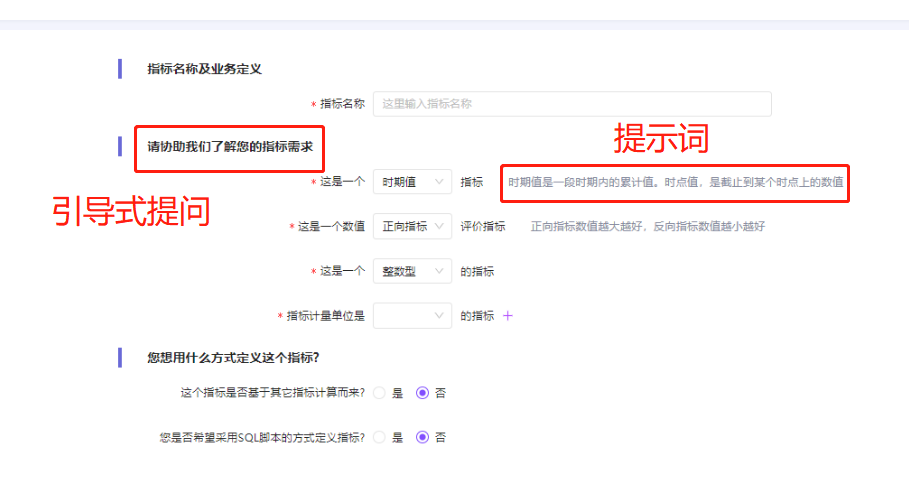 数智云平台为业务人员提供了引导式提示服务,指标业务定义的每个步骤均设置了相关的提示词语,帮助业务人员更好的完成指标定义配置,保证指标业务信息完整性和准确性。