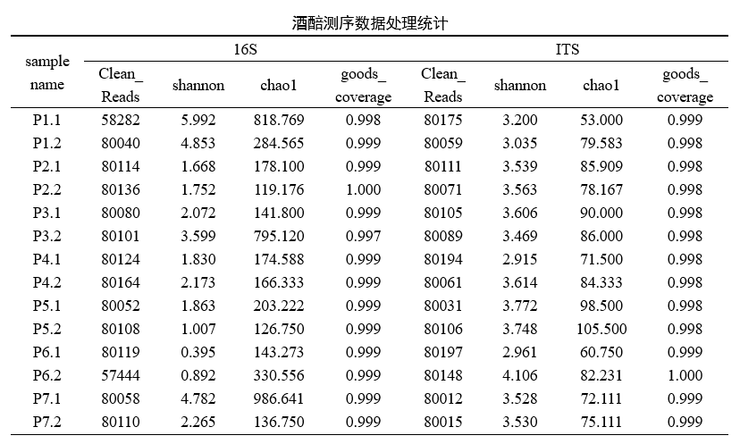 研究中,利用高通量测序技术对清香型白酒大曲和酒醅中的微生物进行多样性分析。对测序结果进行嵌合体过滤,得到有效数据(Clean reads),后续所有分析将建立在有效数据的基础上进行。
