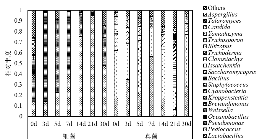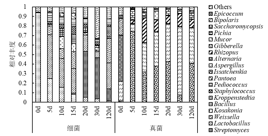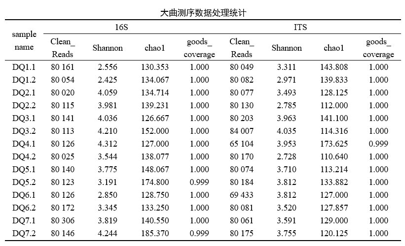 大曲细菌测序结果共得到1121768条高质量的序列,平均每个样本具有80126±180条;真菌结果共得到1099830条高质量的序列,平均每个样本具有78559±13455条。