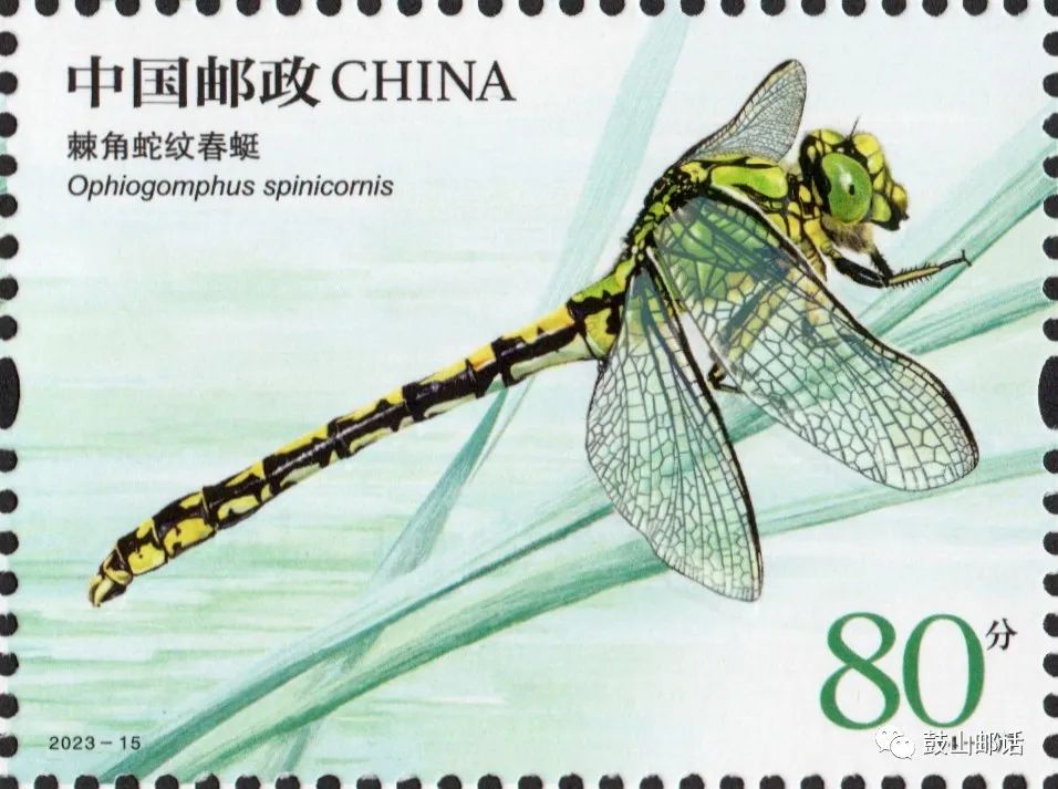 第2枚:棘角蛇纹春蜓。棘角蛇纹春蜓,是春蜓科、蛇纹春蜓属昆虫。雄性腹长40毫米,后翅35毫米,翅痣4毫米,雌性腹长47毫米,后翅40毫米。上、下唇均为黄色,上唇边缘具黄色毛,下唇具黑色毛。头顶黑色,单眼上方具1半弧形隆脊,上被黑色毛,后方有1大黄斑。具黑色长毛的后头缘两侧各有1个黑色齿状突起。前胸黑色,具黄斑。合胸大部分红黄色,脊部黄色,背条纹甚宽。翅透明,后翅约35毫米,翅痣4毫米,红褐色。腹部红黄色,两侧各具1黑色条纹,延至第9、10两节背面形成1椭圆形黄斑。雌性与雄性基本相同,腹较长,后头缘两侧具后头角1对。棘角蛇纹春蜓幼虫孵化后在水中生活,捕食水中的小动物;成虫善于飞翔,不仅远途飞行有耐力,而且飞行技术高超,以小昆虫为主食,是捕食蚊子的好猎手。棘角蛇纹春蜓为中国国家二级保护动物;收录于《世界自然保护联盟红色名录》(IUCN)中,保护级别为无危(LC)。