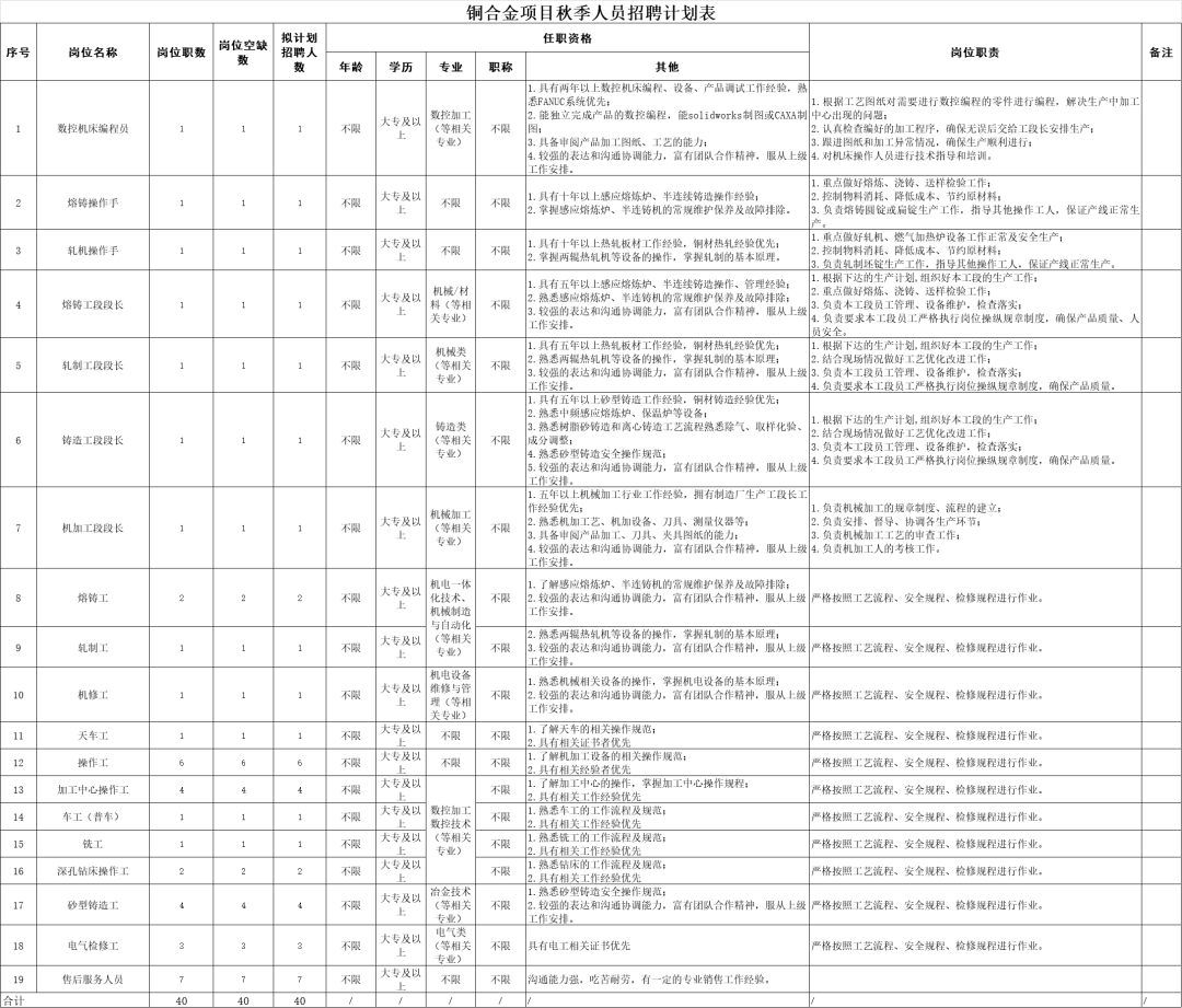 铜合金项目秋季人员招聘计划表