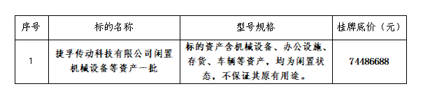 受委托,本公司对捷孚传动科技有限公司闲置机械设备等资产一批进行公开转让,本次标的转让采用网络公开竞价交易。